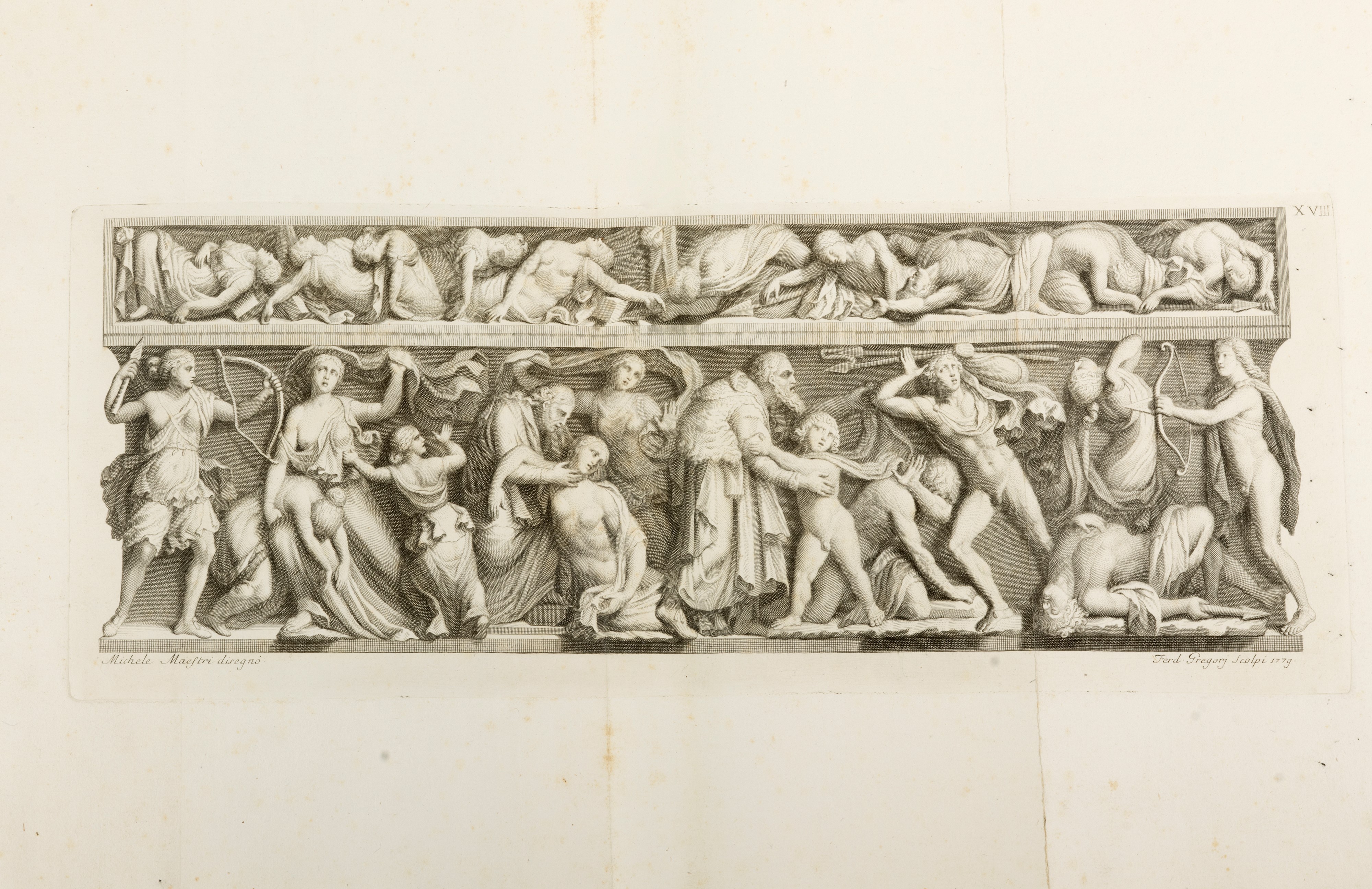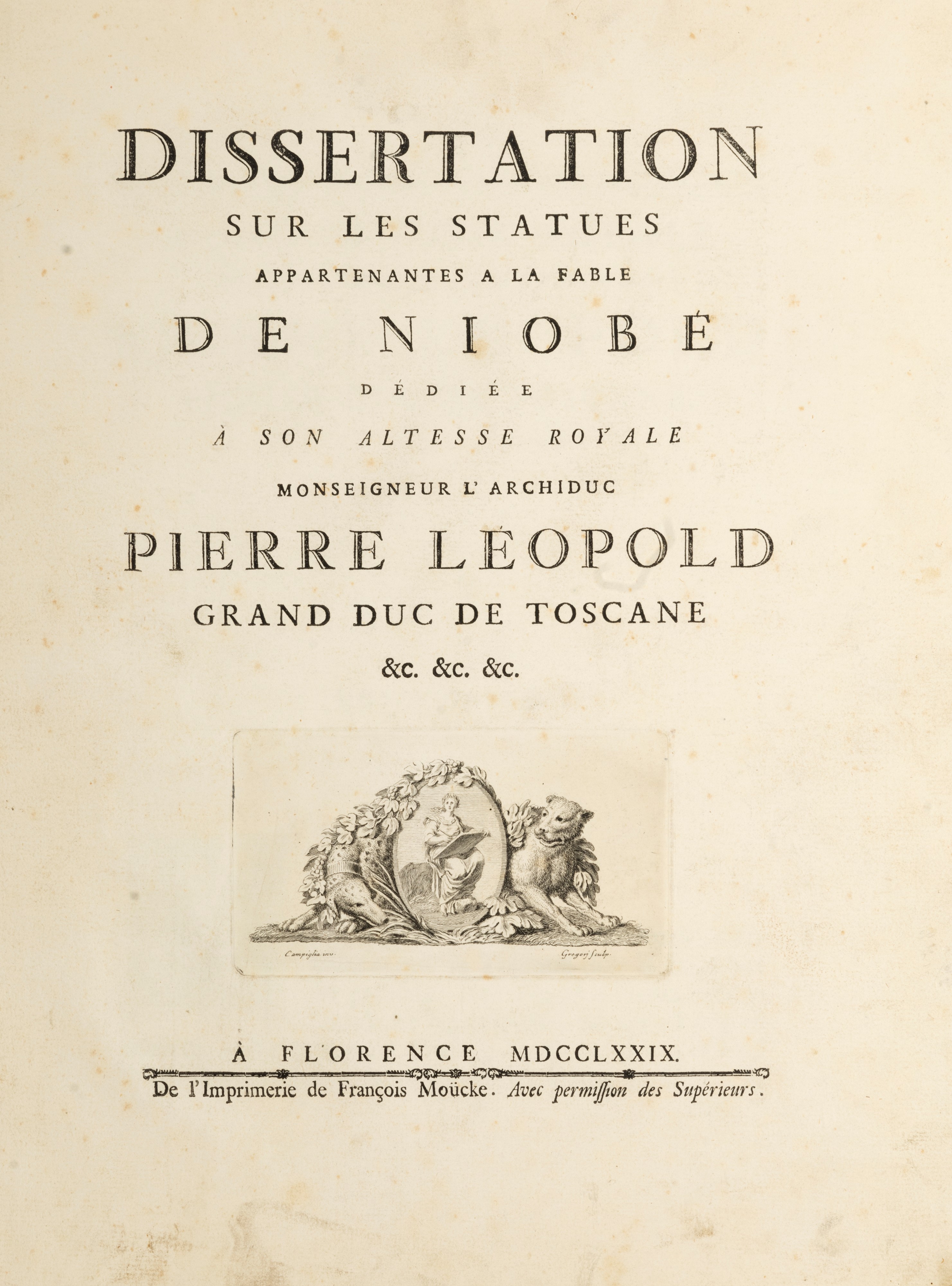 1779 Firenze, Francesco Moucke, 1779. In 2°. Vignetta allegorica al frontespizio, capilettera, testatina di cui 1 ripiegata, finalini figurati, con 19 tavole a piena pagina, qualche macchia e fioriture sparse, legatura del sec. XVIII in mezza pelle marrone, spellature al dorso.