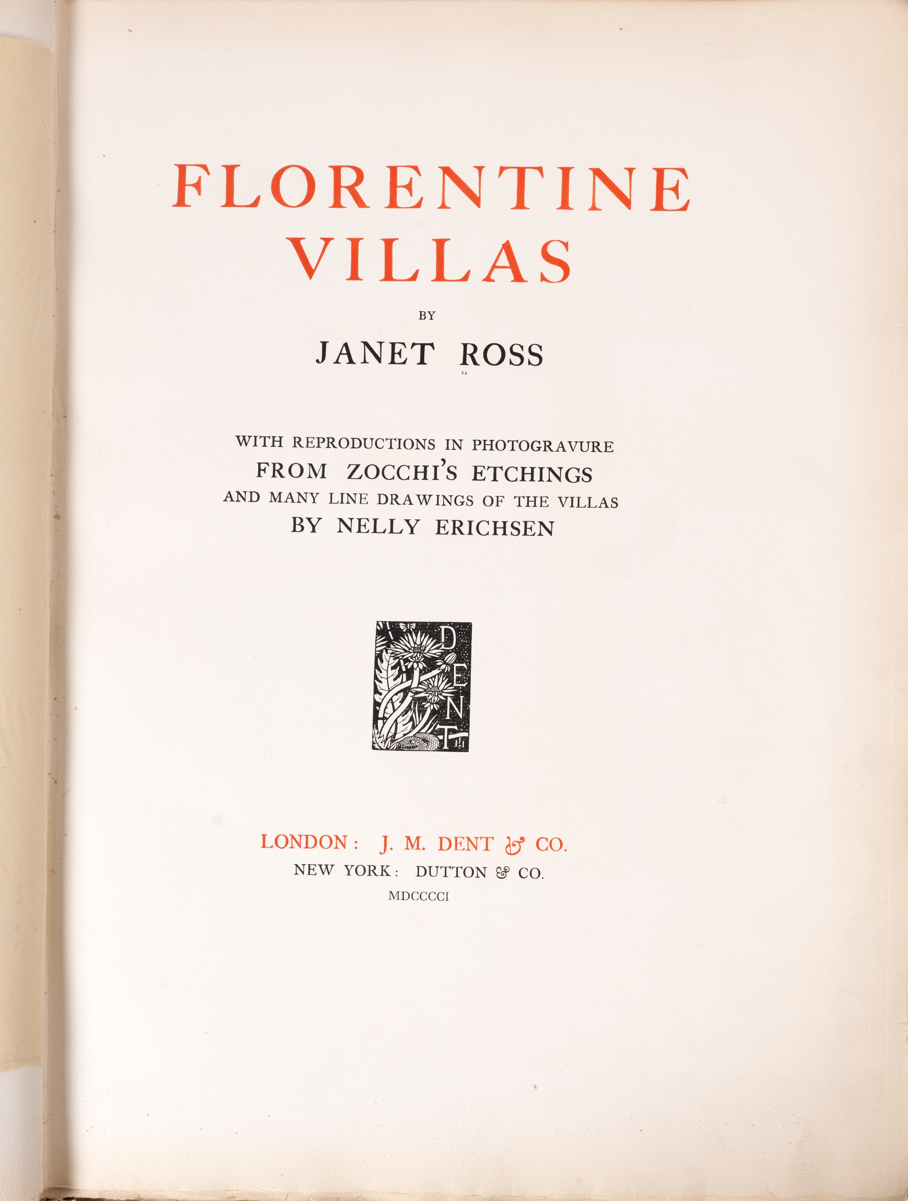 1901 London, J. M. Dent - New York, Dutton, 1901. In 2°. 435 x 310 mm. Con riproduzioni in fotogravure da Zocchi e diverse immagini di ville fiorentine ad opera di Nelly Erichsen, legatura editoriale in mezza pelle e pergamena. Edizione limitata esemplare n.12/25.
