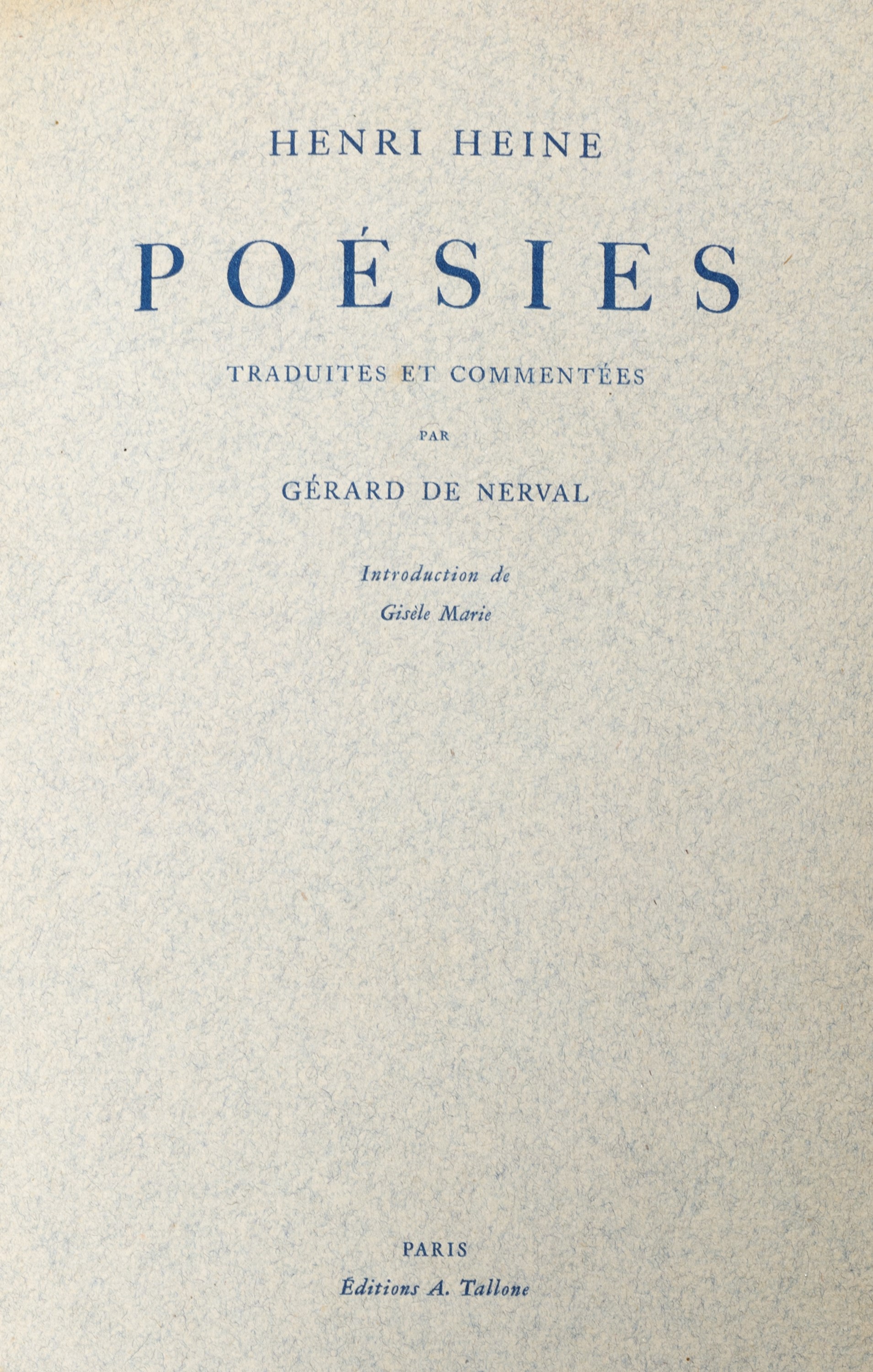 1963 Alpignano, Tallone, 1963. In 8°. Con bella legatura in marocchino rosso e impressioni in oro e a secco, lievi difetti. § Insieme nel lotto altre due edizioni di pregio dell'officina Tallone: Heine, Henri, Poésies, Parigi, Tallone, 1946. (il n. 248 di una edizione di 365 esemplari) e Reyna, Ferdinando, Des Origines du Ballet, Parigi, Tallone, 1955.