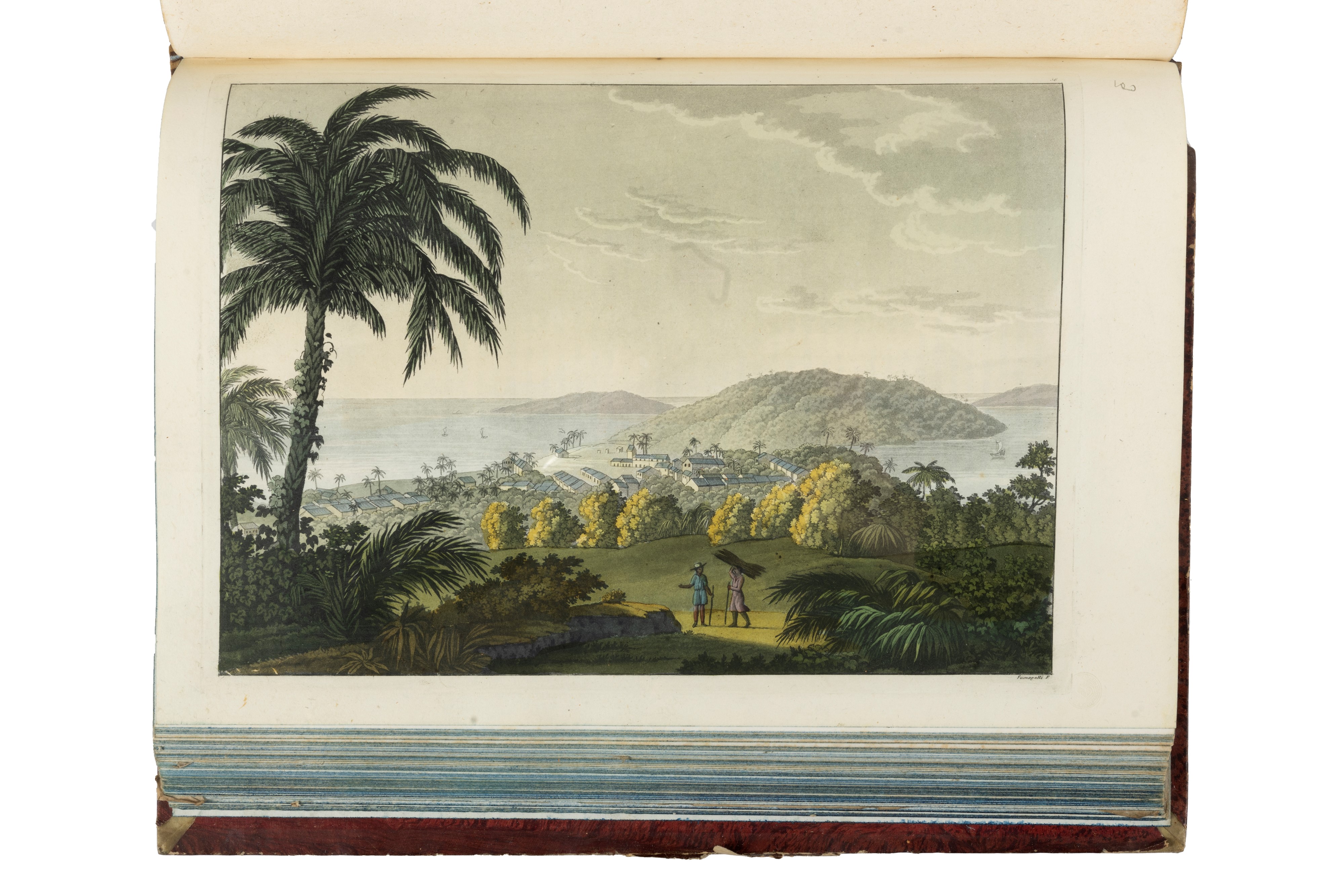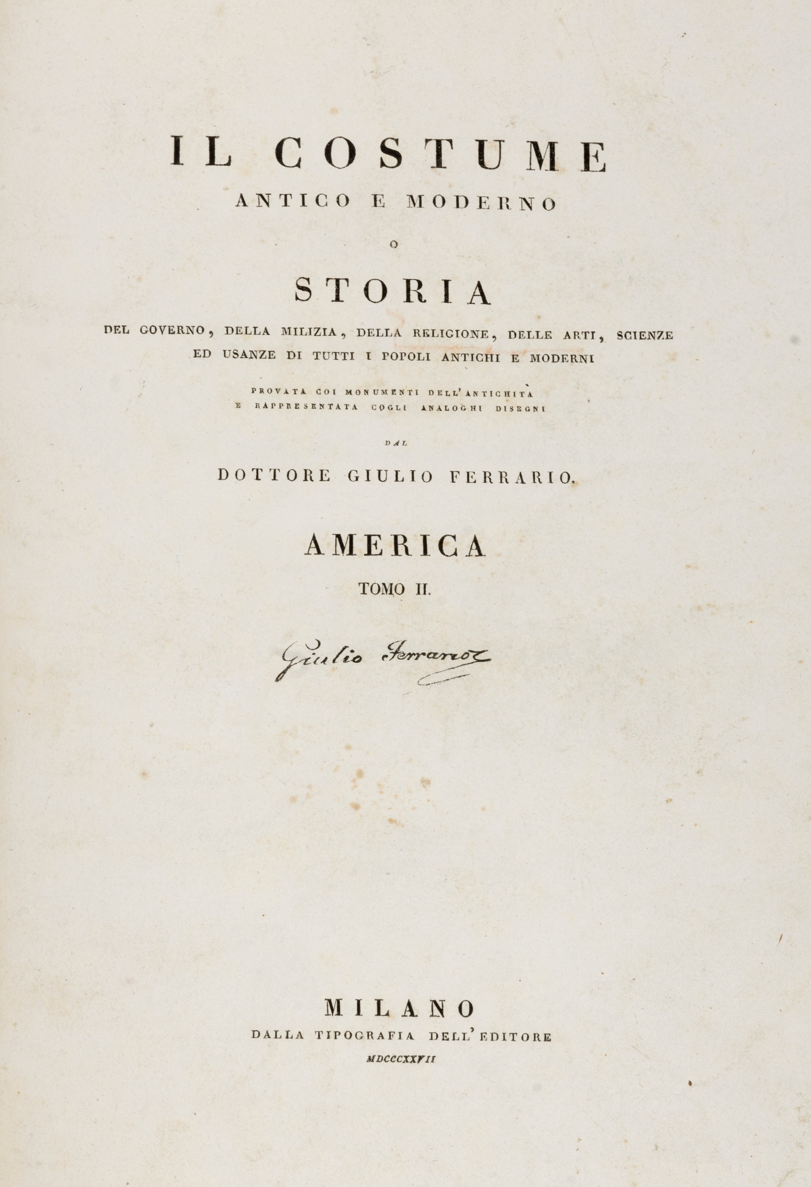 1820 Milano, dalla Tipografia Dell' Editore, 1820 - 27. In 2°. Solo i 2 voll. dell'America. Con complessive 167 tavole incise all'acquatinta e colorate a mano d'epoca, ognuna protetta da velina, inclusa una grande carta geografica più volte ripiegata, qualche leggera gora d'acqua, sporadiche fioriture, legatura coeva in mezzo marocchino marrone, dorso a 5 nervi, ai comparti autore e titolo impressi in oro e fregi a secco, piatto anteriore e dorso del I vol. leggermente staccati dal corpo del libro, tagli azzurri, piccole mancanze, lievi difetti.