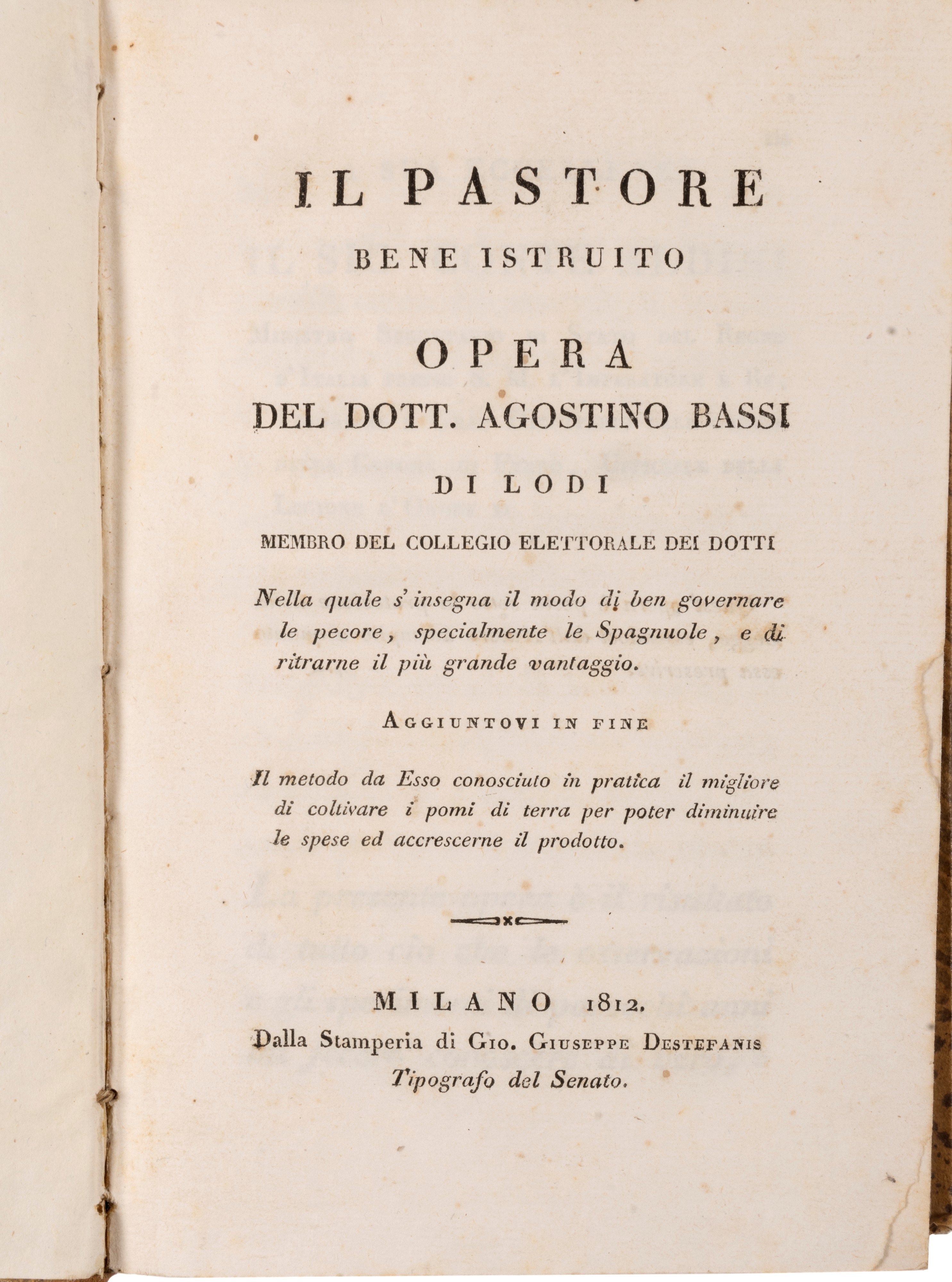 1786 Venezia, Pezzana, 1786. In 8°. Fregio al frontespizio, 22 tavole incise in rame, qualche fioritura, legatura coeva in mezza pelle con angoli, titoli in oro su tassello rosso al dorso e fregi dorati, lievissime abrasioni. Ex libris al contropiatto. § Il pastore bene istruito opera del dott. Agostino Bassi. Milano, Destefanis, 1812. In 8°. Una grande tavola ripiegata a fine volume, qualche lieve fioritura, legatura coeva in mezza pelle, titoli in oro su tassello al dorso.