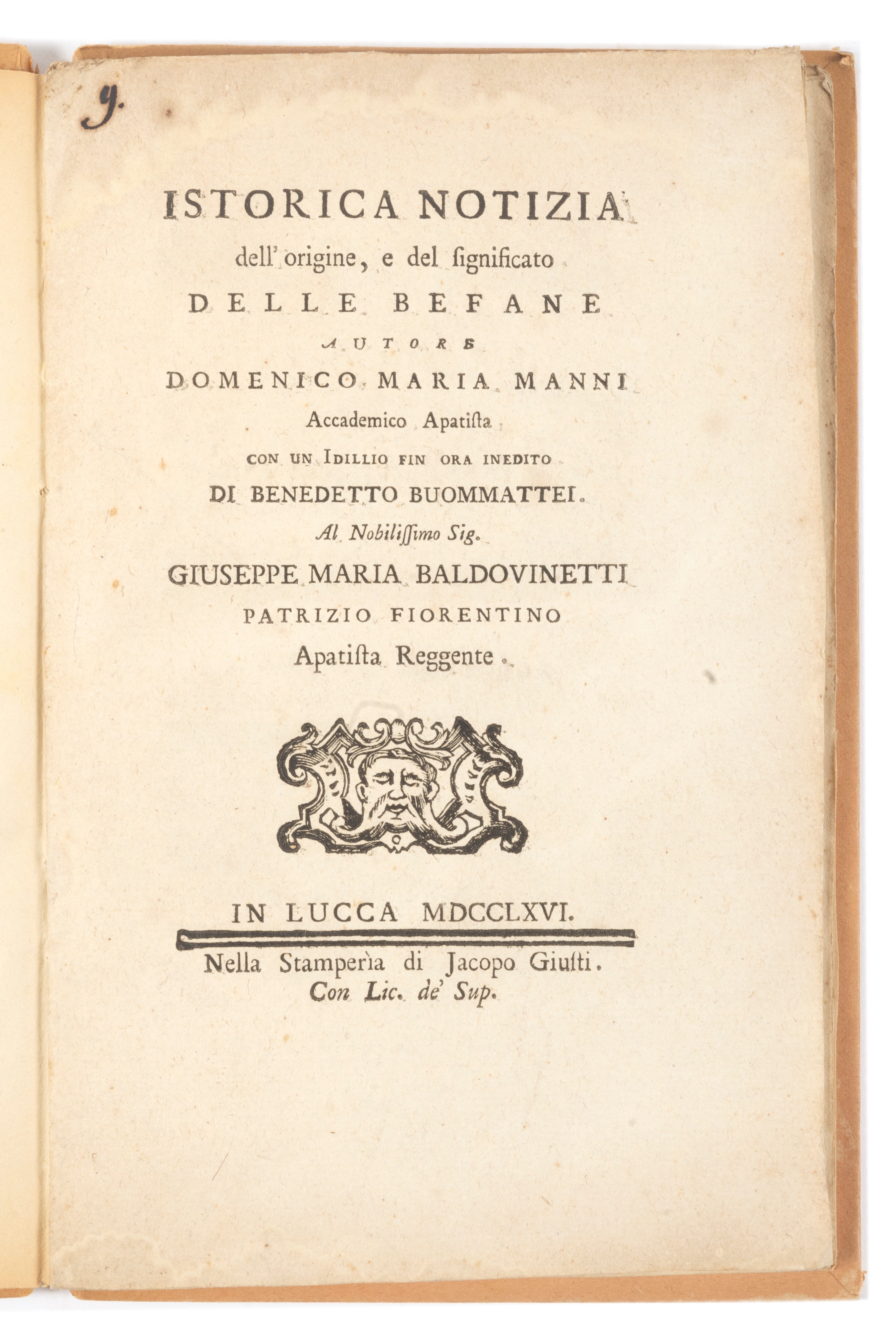1766 Lucca, Jacopo Giusti, 1766. In 4°. Fregio xilografico sul frontespizio, marginali bruniture, legatura coeva in cartone rosa.