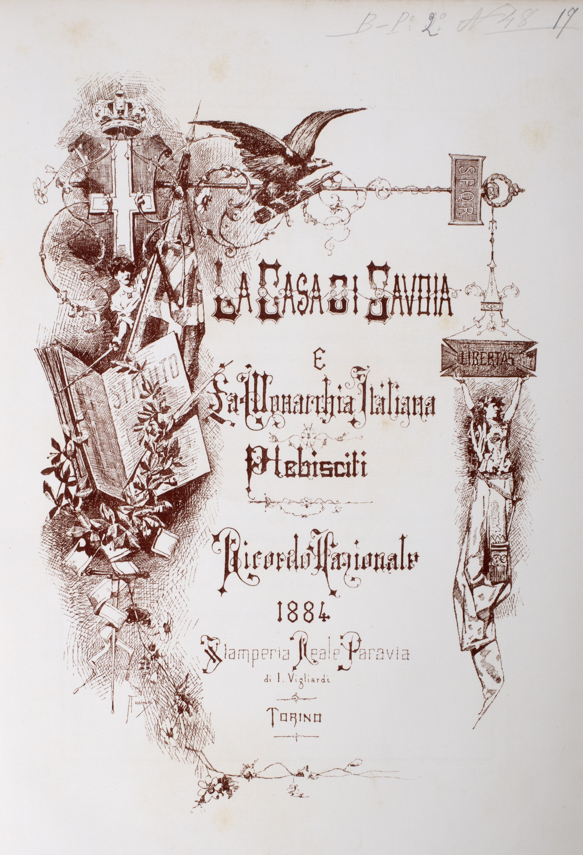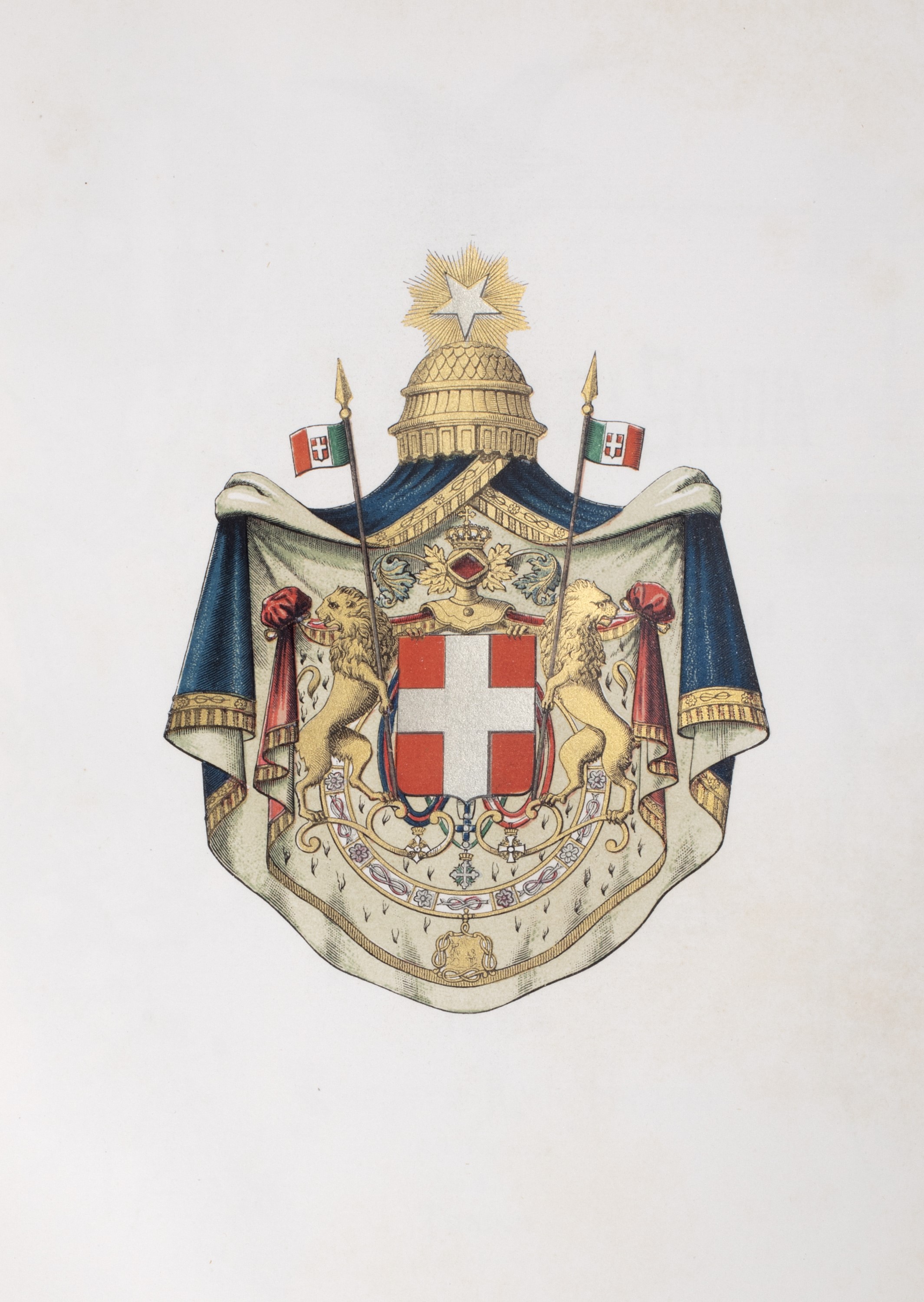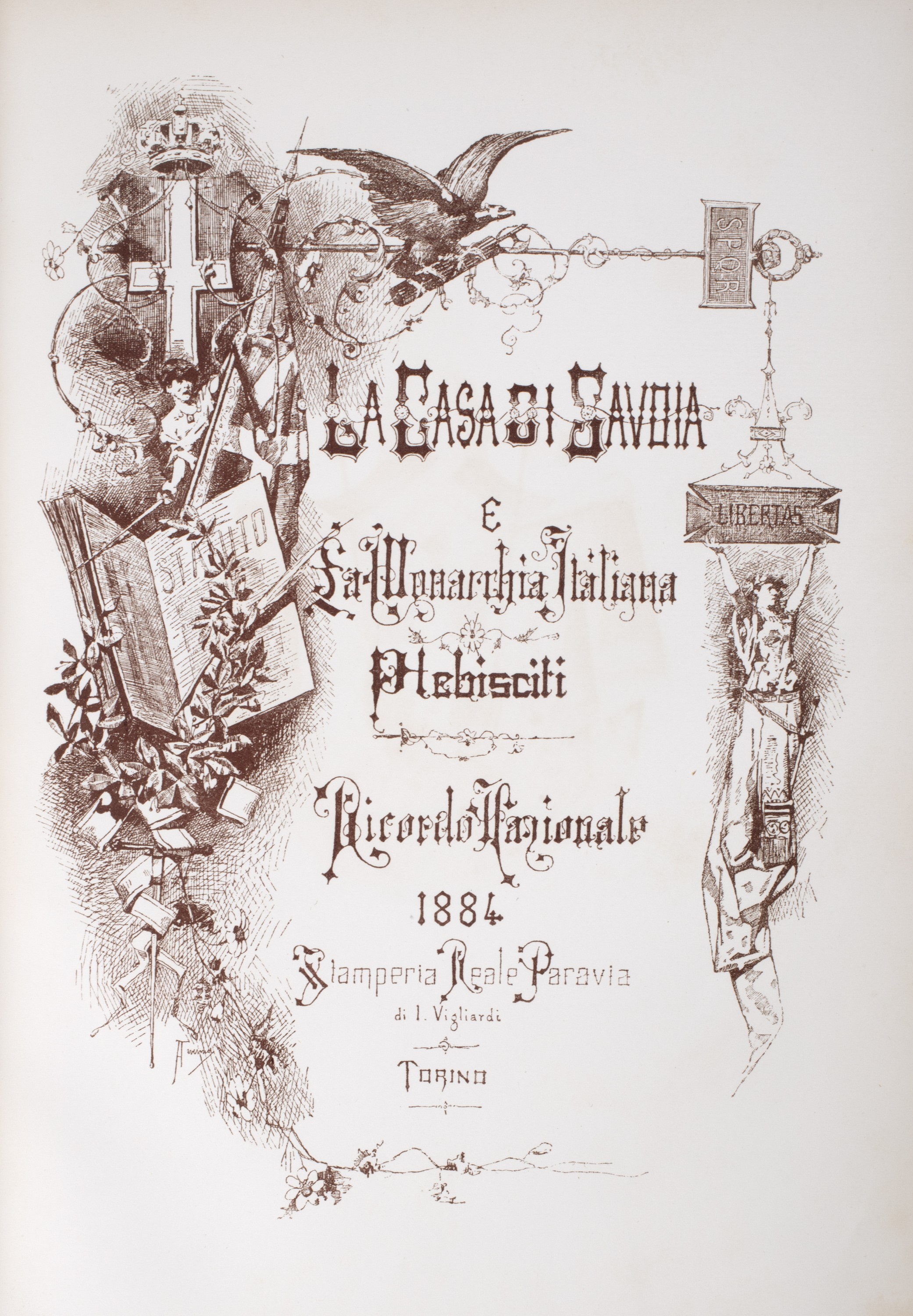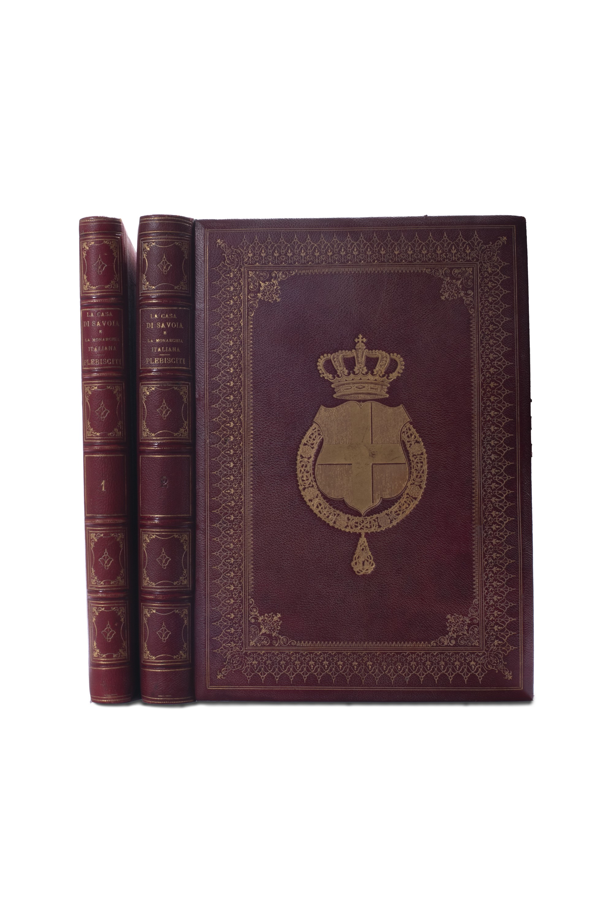 1884 Torino, Paravia, Torino, 1884,. in 4°. 2 voll. Testo inquadrato da cornice in rosso e nero, 2tavole in bianco nero con medaglie commemorative, 21 tavole fuori testo raffiguranti stemmi delle città italiane, eseguite in cromolitografia, ciascuna protetta da velina, entrambi i volumi in legatura in marocchino rosso con decorazione impressa in oro, al centro dei piatti anteriori le armi di Casa Savoia, al piede del dorso del primo volume firma del legatore TARDITI, alcune macchie di inchiostro e leggera scoloritura al secondo volume.