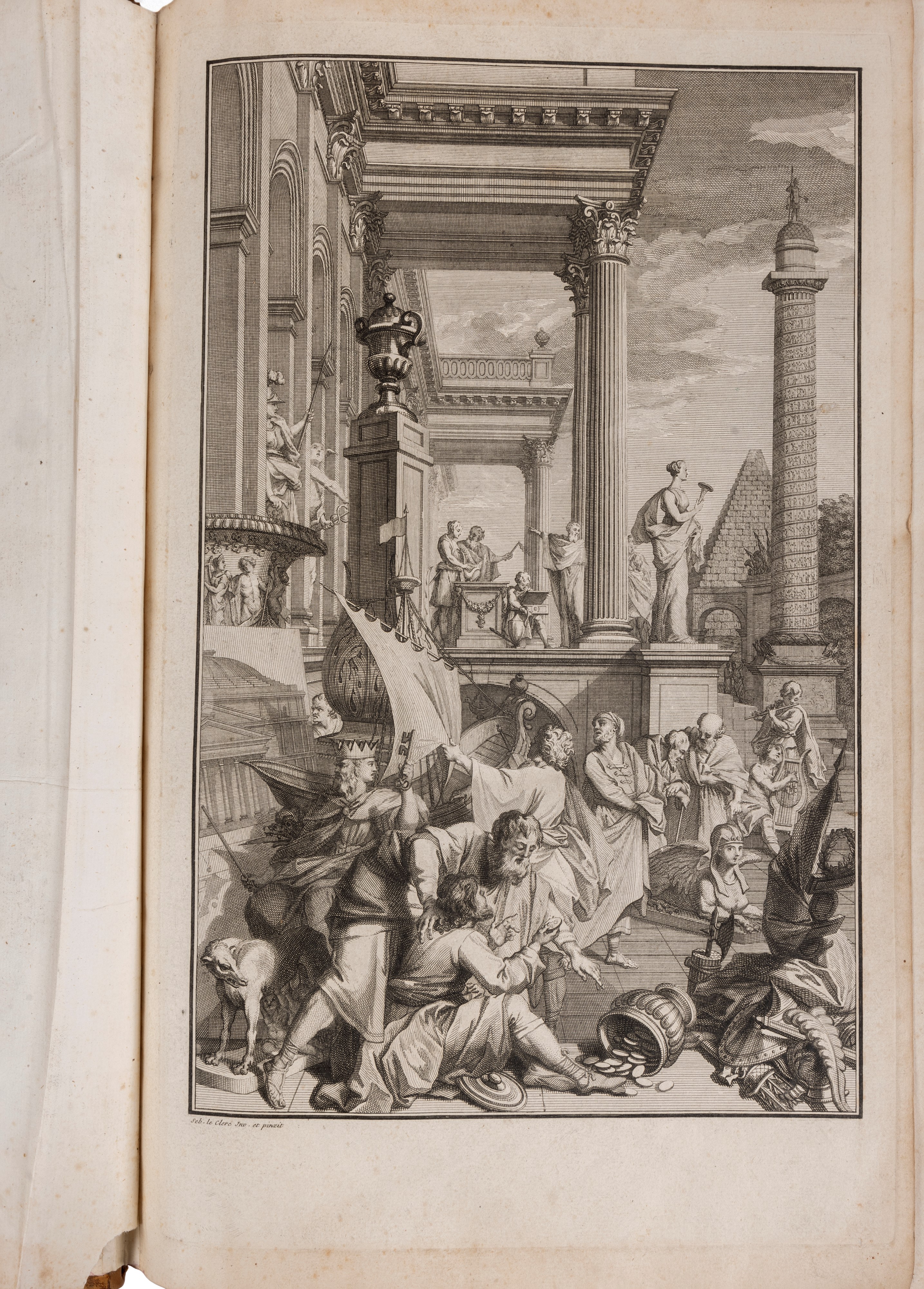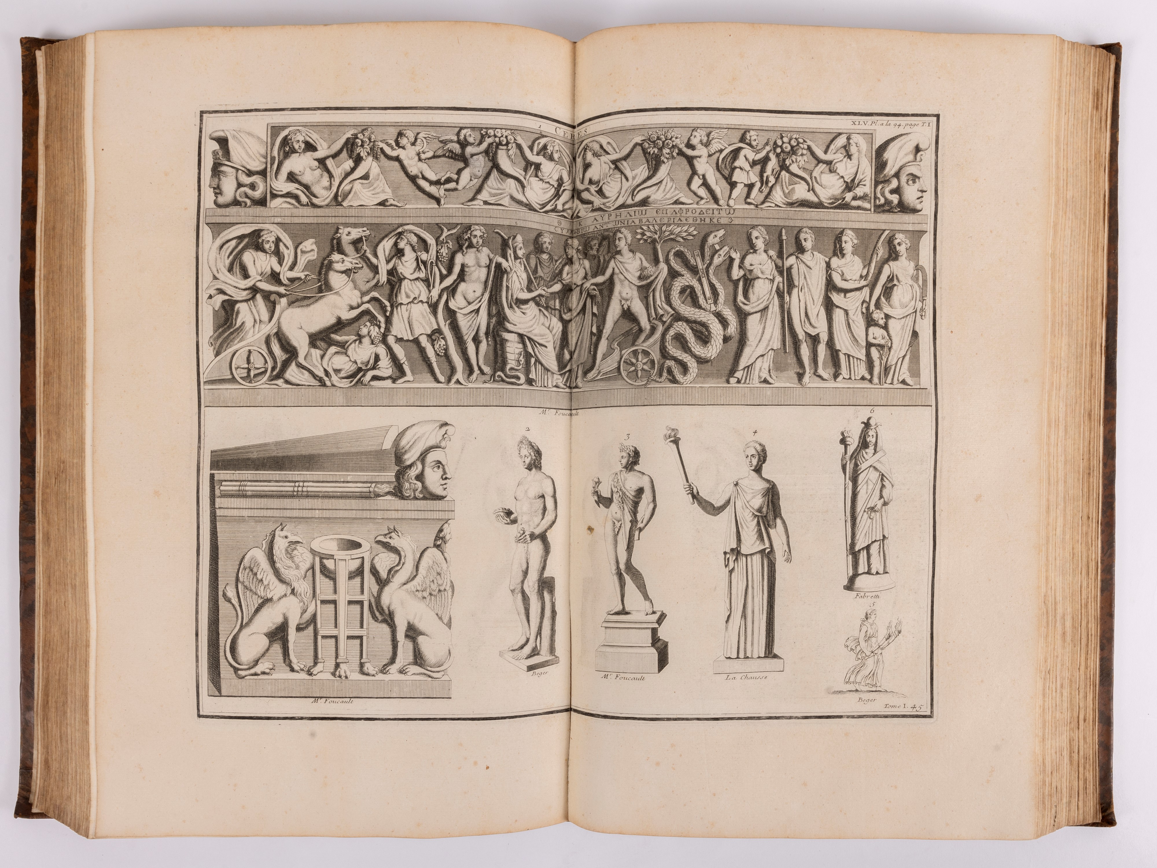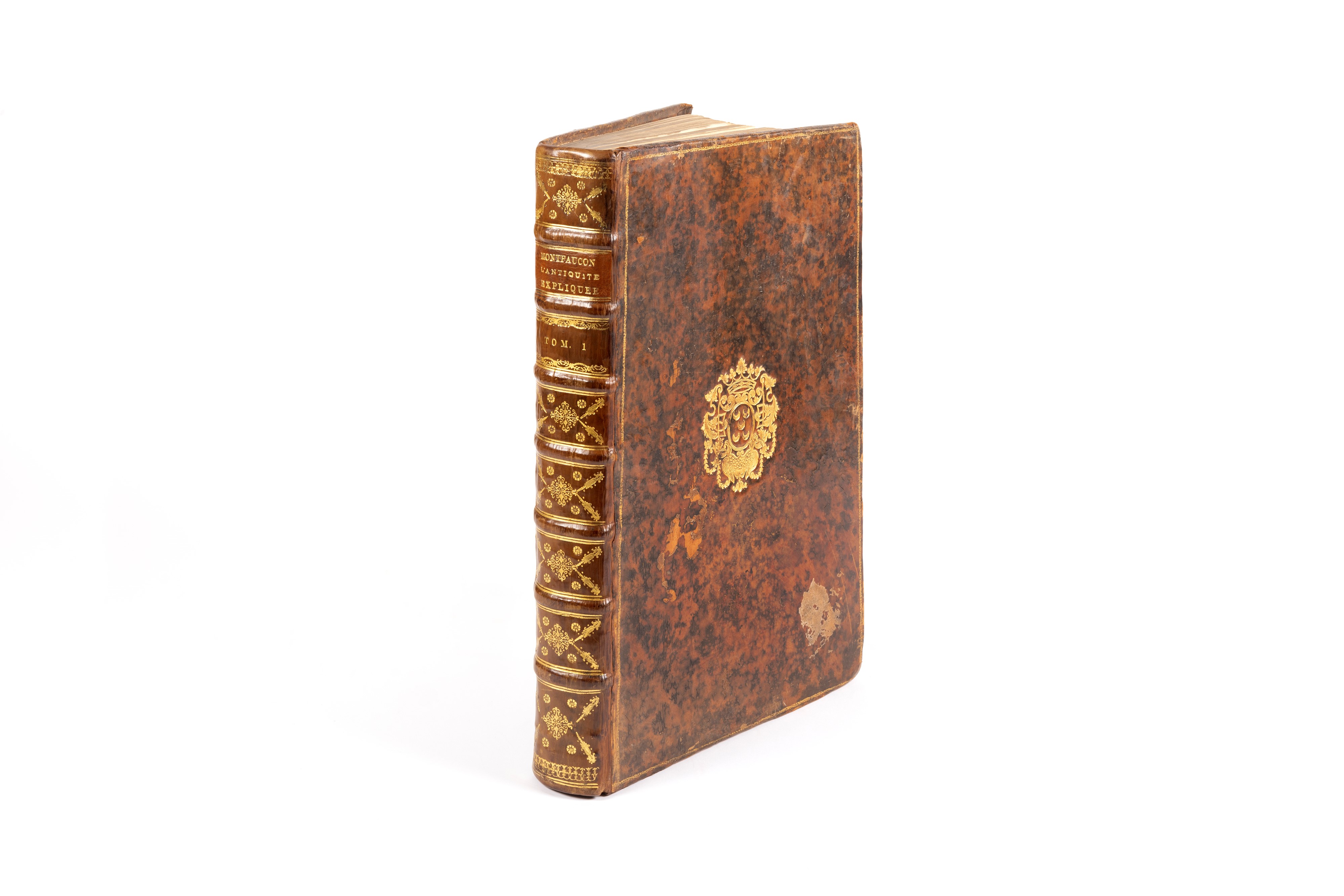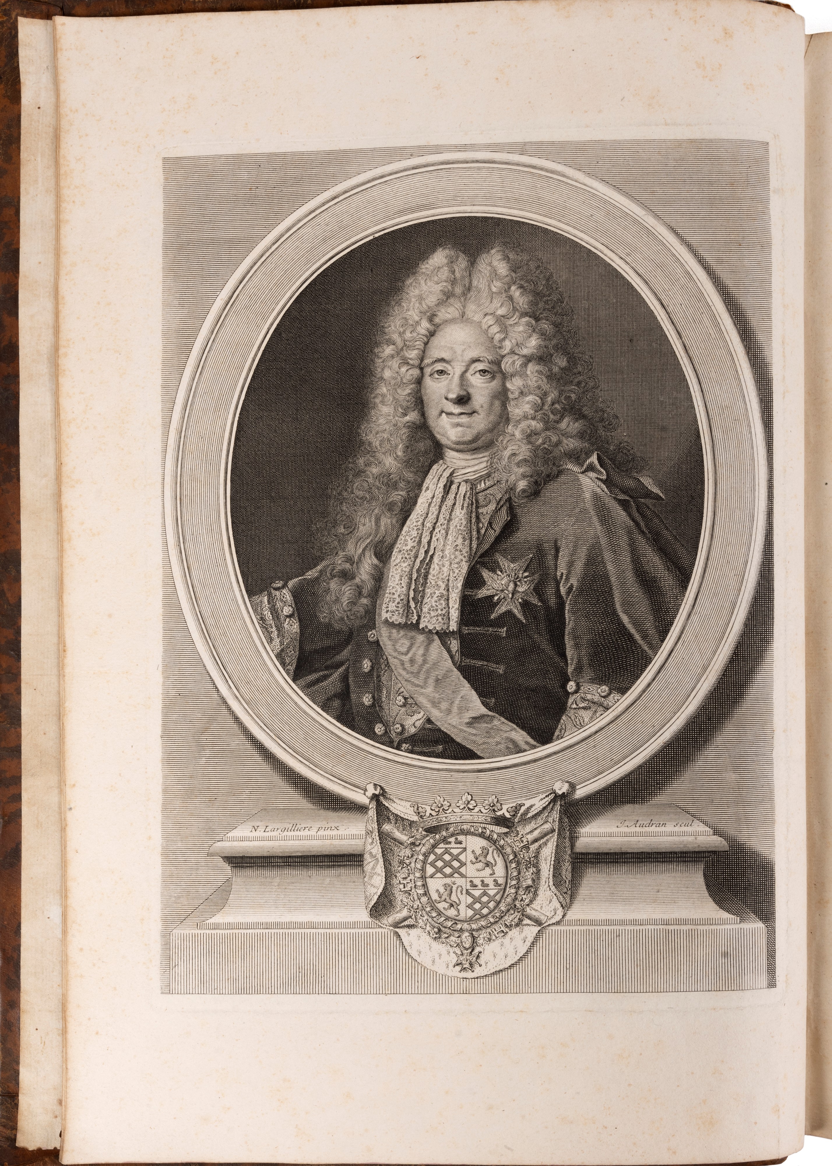 1722 Paris, chez Florentin Delaulne, Étienne Ganeau et al., 1722. In 2°, 428 x 275 mm. Quasi 1400 incisioni in rame per le quali sono stati impegnati più di quaranta incisori, fuori testo: frontespizio di Sébastien Le Clerc, ritratto del dedicatario, il Maréchal d'Estrées, di Jean Audran da Nicolas de Largillière, 1394 tavole di cui 3 piegate e 242 a doppia pagina, lievi arrossature. SPLENDIDA LEGATURA COEVA IN VITELLO SPUGNATO, con dorso a 7 nervi a racchiudere scomparti decorati in oro, titolo al dorso a lettere dorate su tassello rosso, al centro dei piatti splendido stemma di Manuel Pinto de Fonseca (1681-1773), nobile portoghese, Gran Maestro dell'Ordine di Malta dal 1741 fino alla sua morte.
