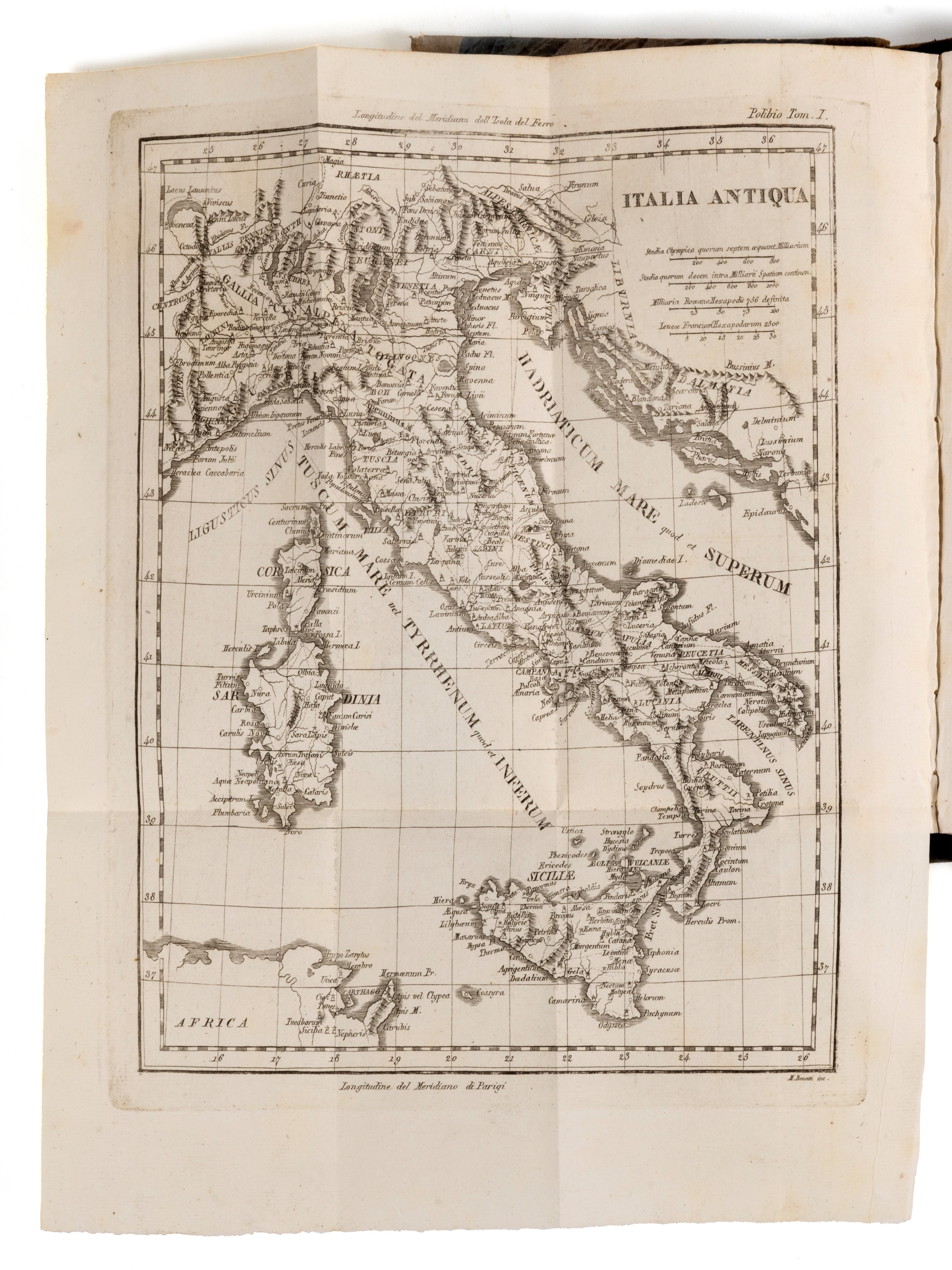 Milano, Fratelli Sonzogno e Andrea Molina, 1824-1834. In 8°. 6 voll. Con numerose tavole di carte geografiche ripiegate, qualche lieve arrossatura e fioritura, legatura coeva in mezzo marocchino verde e carta marmorizzata, titolo, fregio e numero di tomo in oro al dorso, lievi difetti, piccolo strappo senza perdita al dorso del vol. 1.