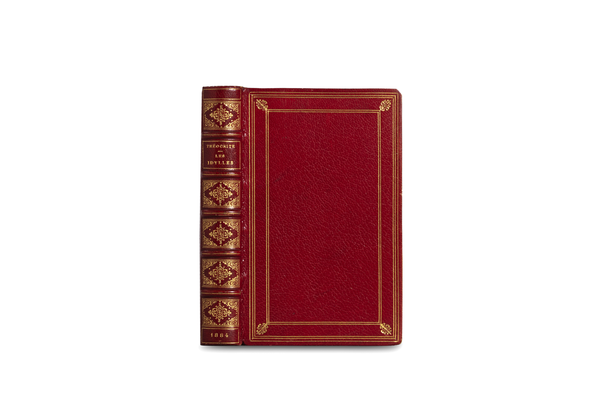 1884 Parigi, Quantin, 1884. In 8°. Frontespizio e testo inquadrati da cornice, con 27 incisionidi Meaulle, di cui 12 colorate a mano ed arricchite con oro, elegante legatura coeva in marocchino rosso firmata A. Bonnay , decorazione impressa in oro, ai piatti due cornici di duplice filetto, ai 4 angoli piccoli festoni, dorso a 5 nervi, con titoli e fregi.
