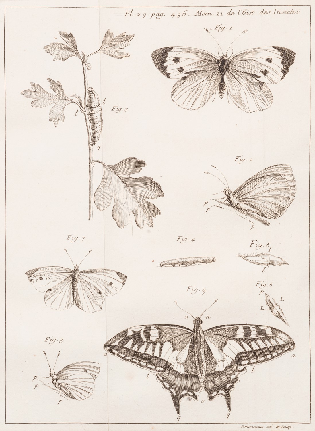 1734 Parigi, Imprimerie royale, 1734-1742. In 4°. 6 volumi, 6 testatine e 6 iniziali calcografiche a c. A1r di ciascun volume, fregi xilografici, complessive 267 tavole incise ripiegate, tavv. 32-34 del vol. V legate in fine del vol. VI, c. D1 del vol. VI di formato maggiore, alcune fioriture e leggere bruniture e qualche segno di umidità , cartiglio con finis sull'ultima c. del vol VI, piccoli difetti ai dorsi, legatura coeva a cinque nervi in pelle, due tasselli ai dorsi con dati editoriali in oro, fregi oro al dorso.