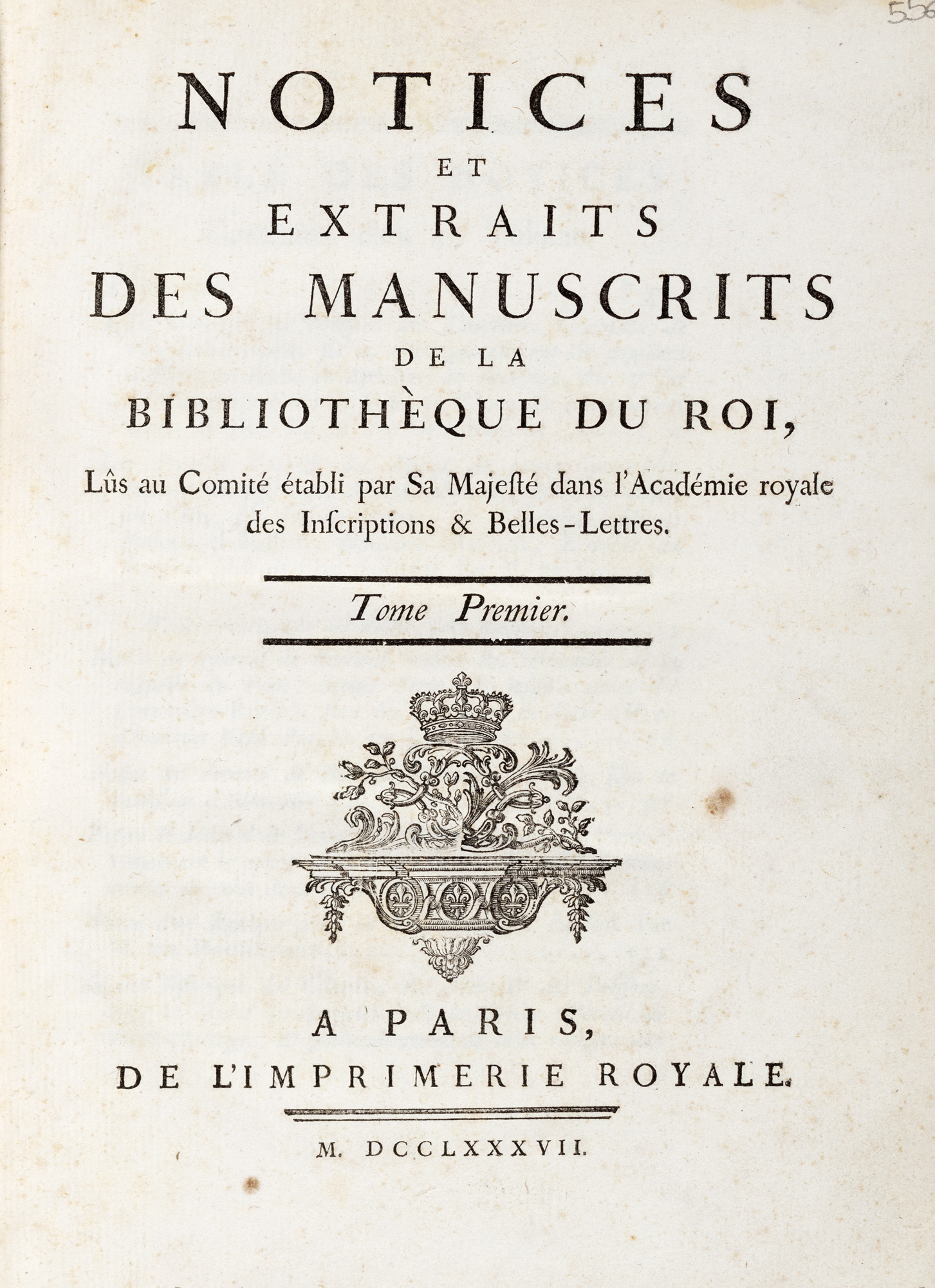 Parigi, Imprimerie Royale, 1787. In 4°. 2 voll. (vol. terzo mancante). Marca tipografica al frontespizio, testatine tipografiche, fioriture, legatura coeva originale in vitello marrone marmorizzato coevo, dorso a 5 nervi, ai comparti titolo e fregi impressi in oro, tassello in pelle verde con tomazione, tagli rossi, lievi mancanze. Ex libris A. Kuhnholtz inciso inciso me disegnato da Dupont.