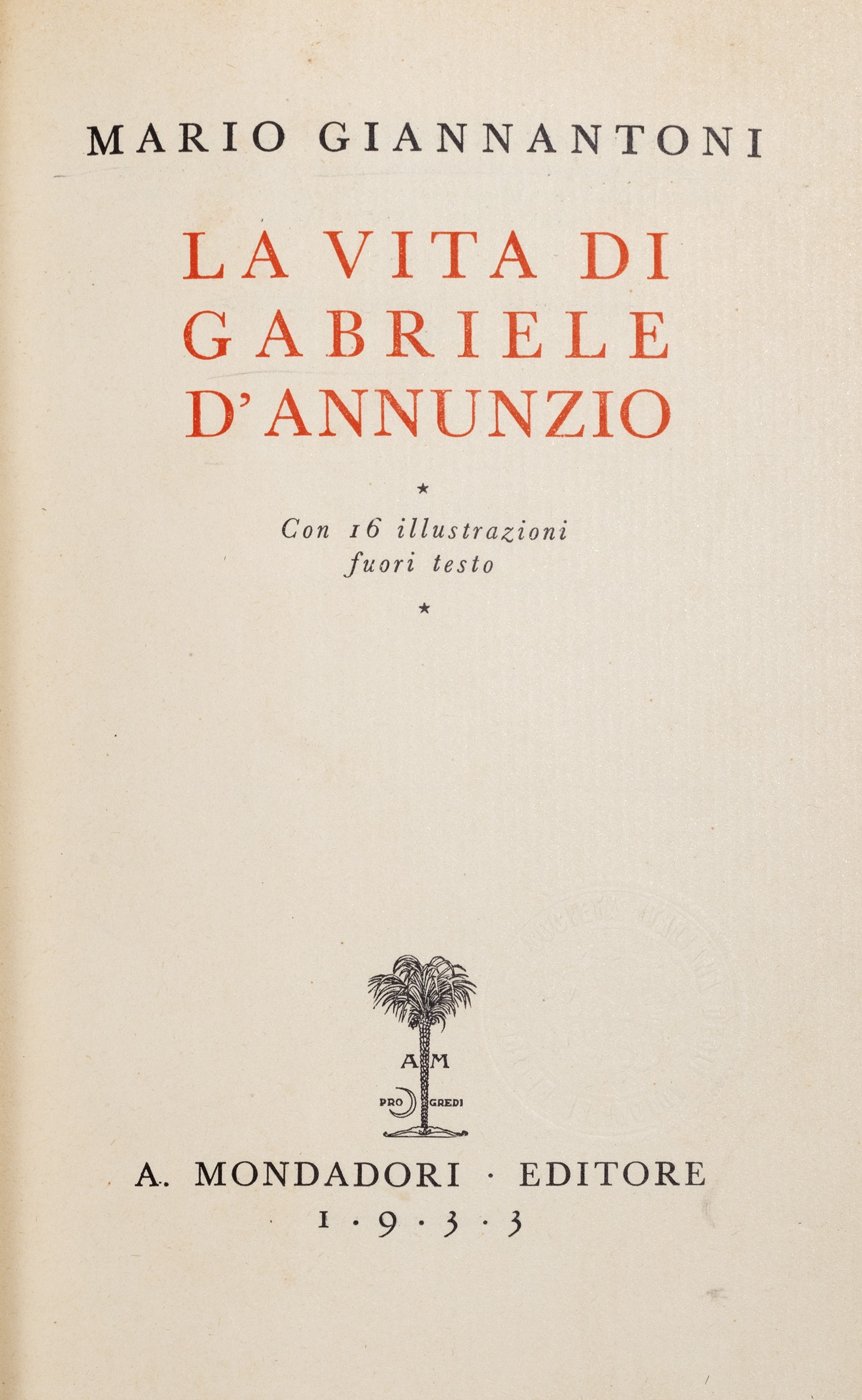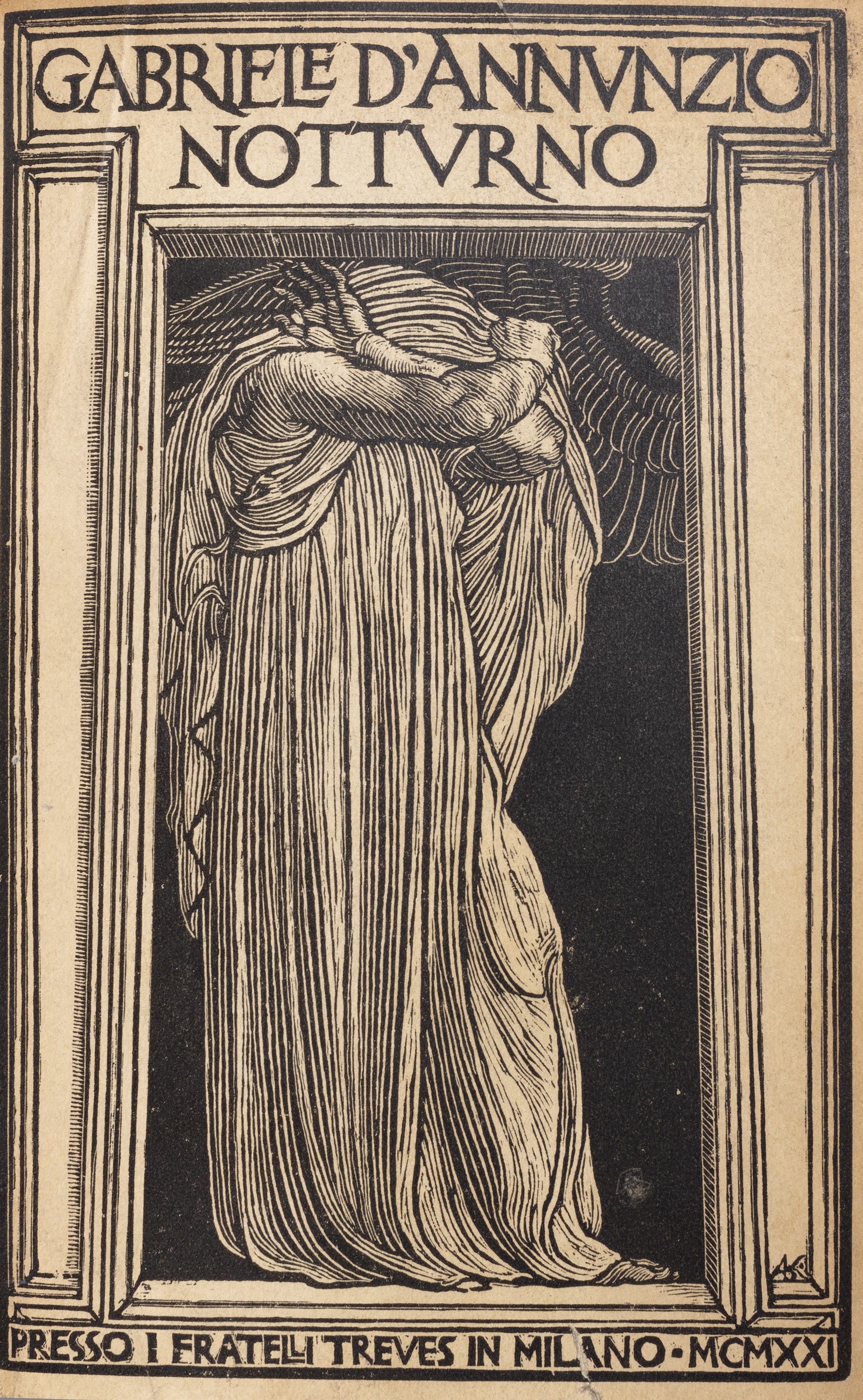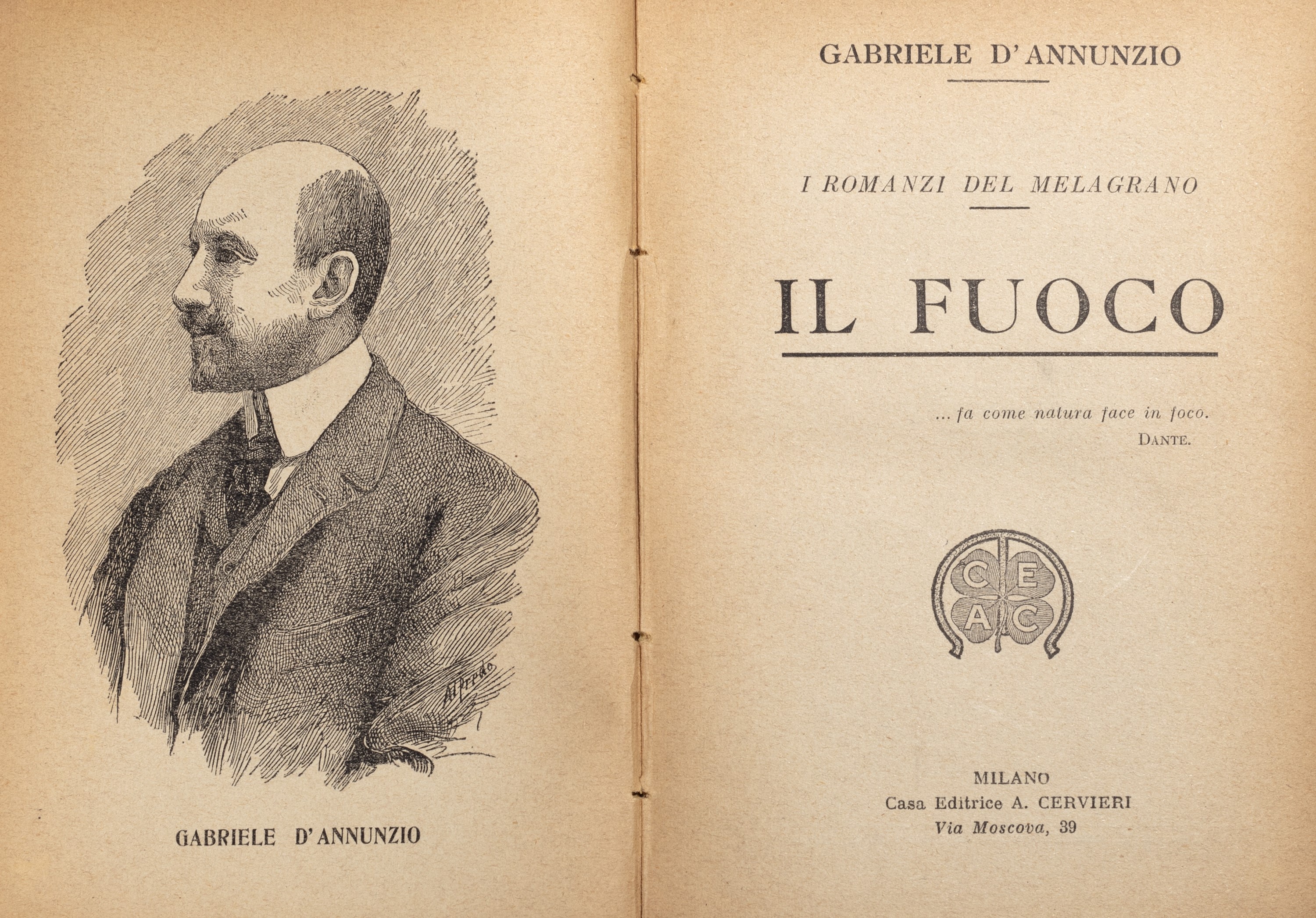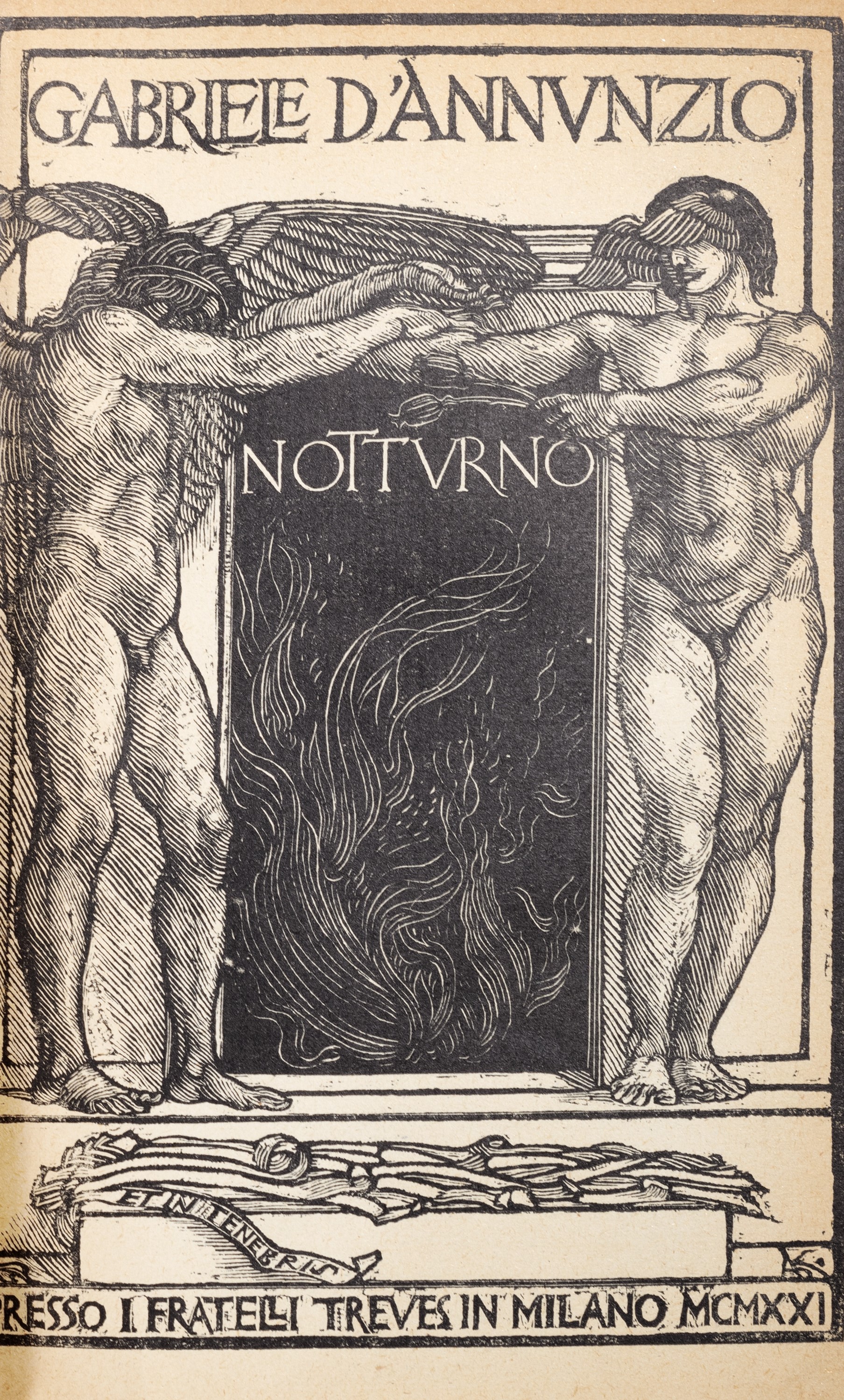 Milano, Fratelli Treves, 1921. In 8°. Con numerose xilografie realizzate da Adolfo de Carolis, leggera brunitura, qualche lieve difetto, rilegato in mezzo marocchino rosso e carta marmorizzata. § Insieme nel lotto altre 14 edizioni d'annunziane: Lettera ai dalmati, Venezia, 1919; La figlia di Iorio, Milano, Treves, s.d.; Il Fuoco, Milano, Cervieri; L'Intrus, Parigi, Calmann Levy, 1894; Contemplazione della morte, Milano, Fratelli Treves, 1920; La fiaccola sotto il moggio, Milano, Fratelli Treves, 1905; L'Innocente, Milano, Treves, 1899; L'Innocente, Roma, L'Oleandro, 1934; Le faville del Maglio, Milano, Treves, 1924; La beffa di Buccari, Milano, Treves, 1918 § Più che l'amore, Milano, Treves, 1907. § Giannantoni, Mario, La vita di Gabriele D'Annunzio, Milano, Mondadori, 1933.