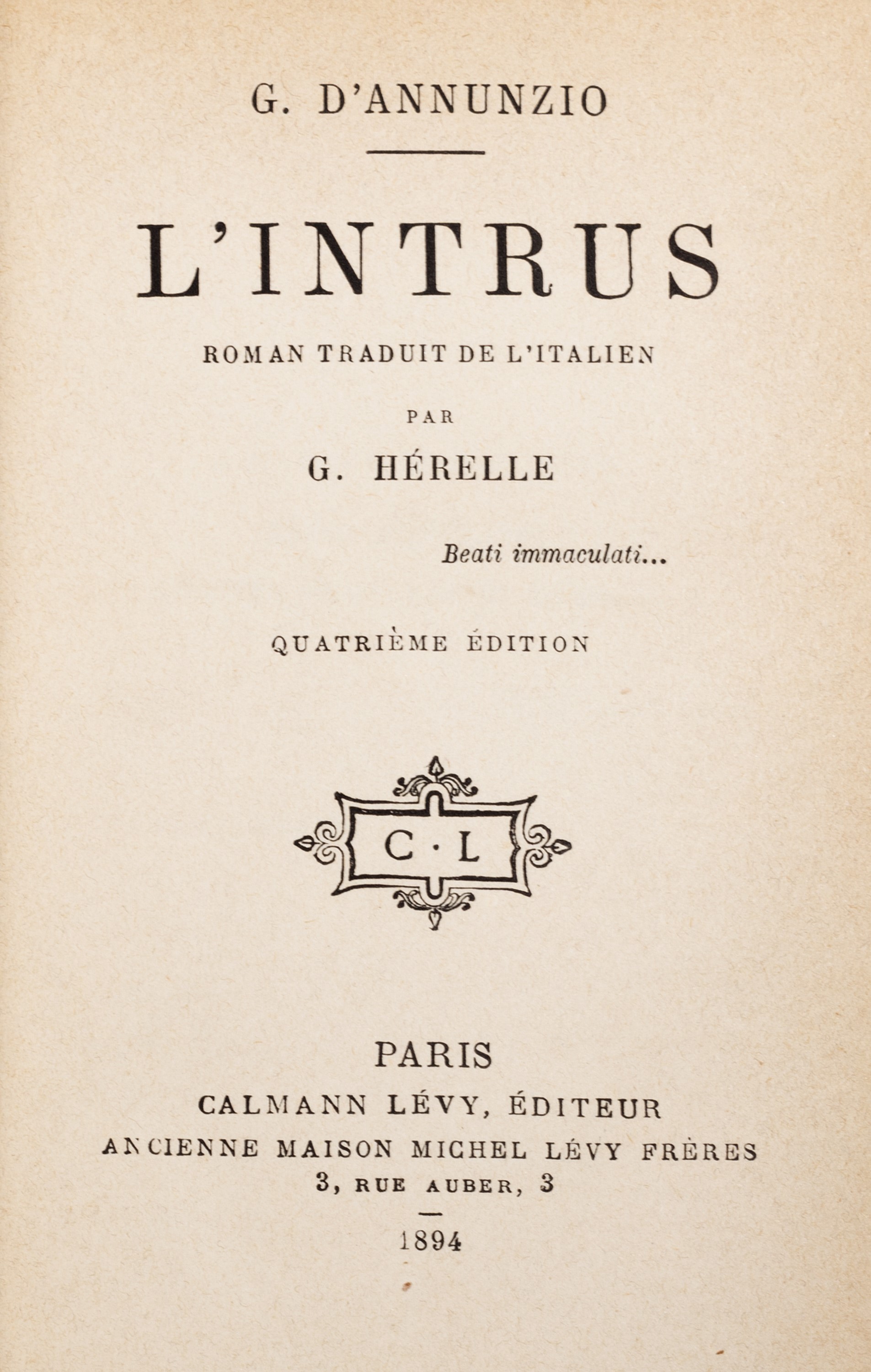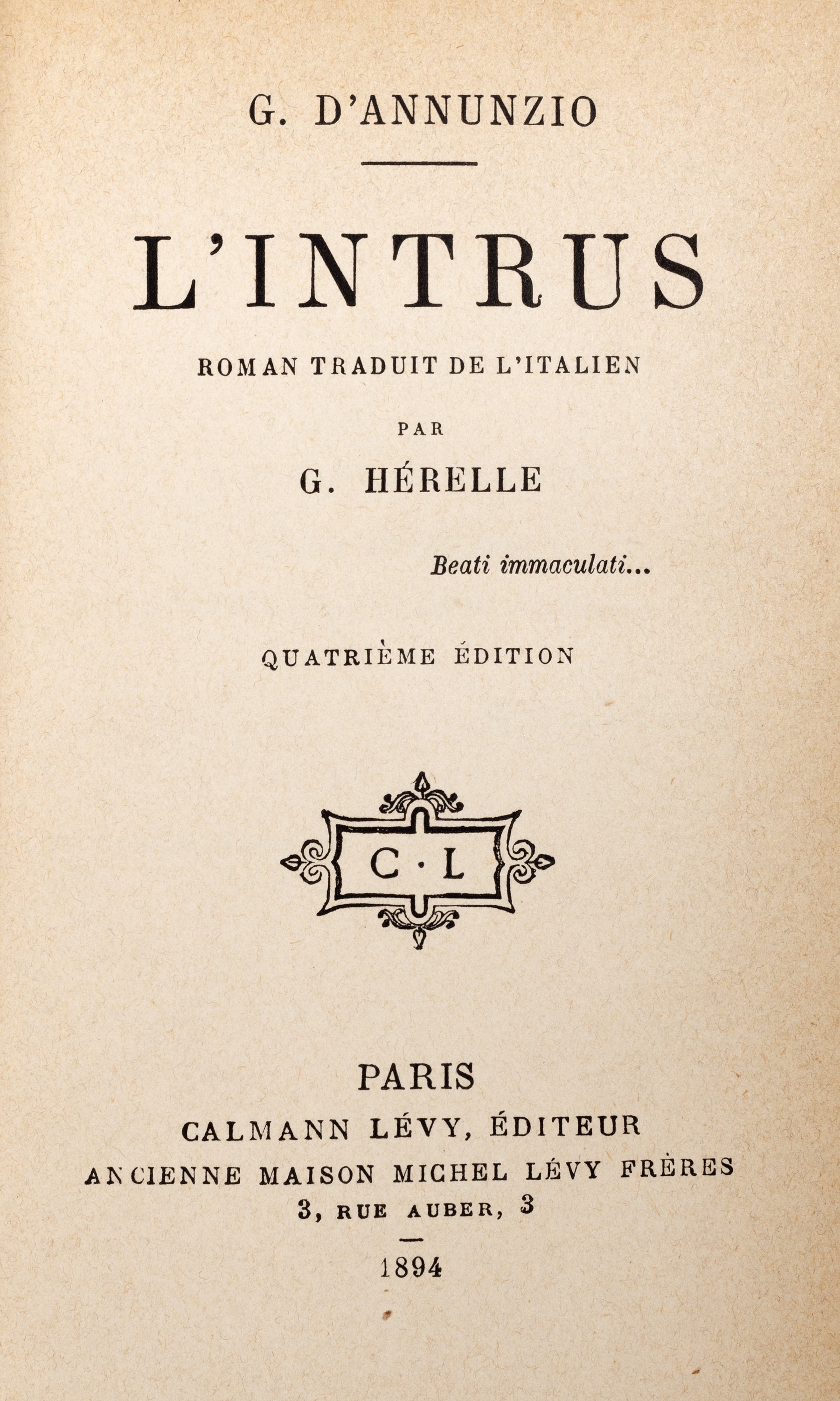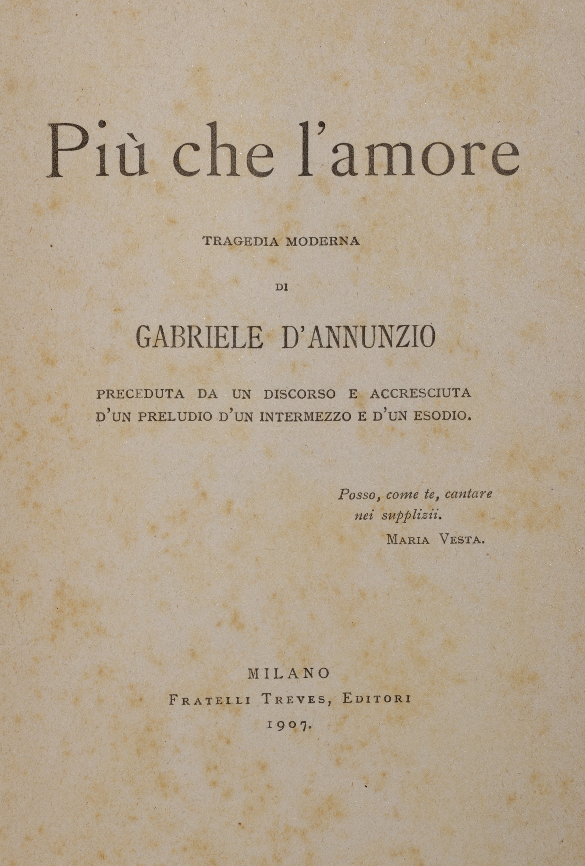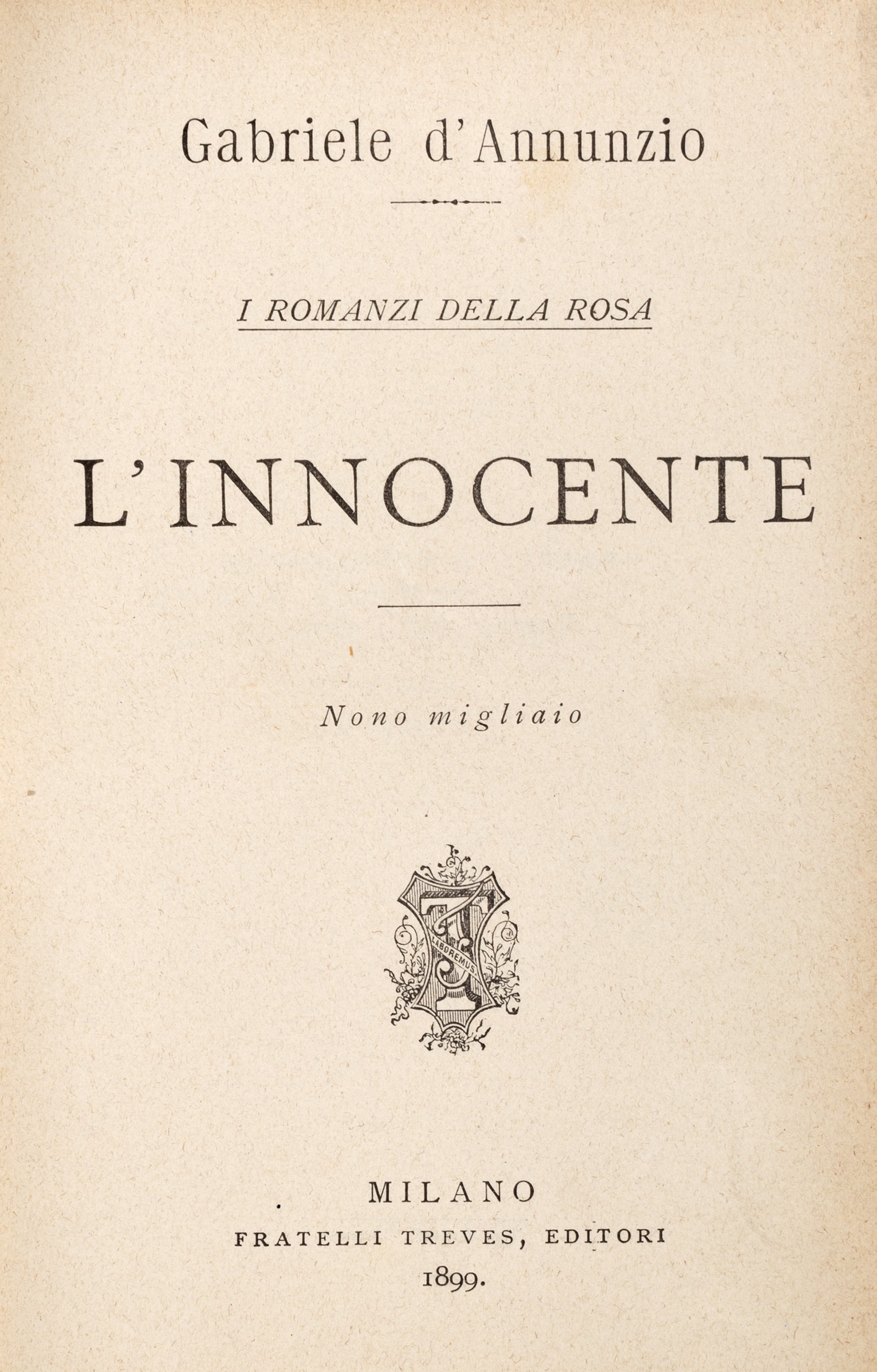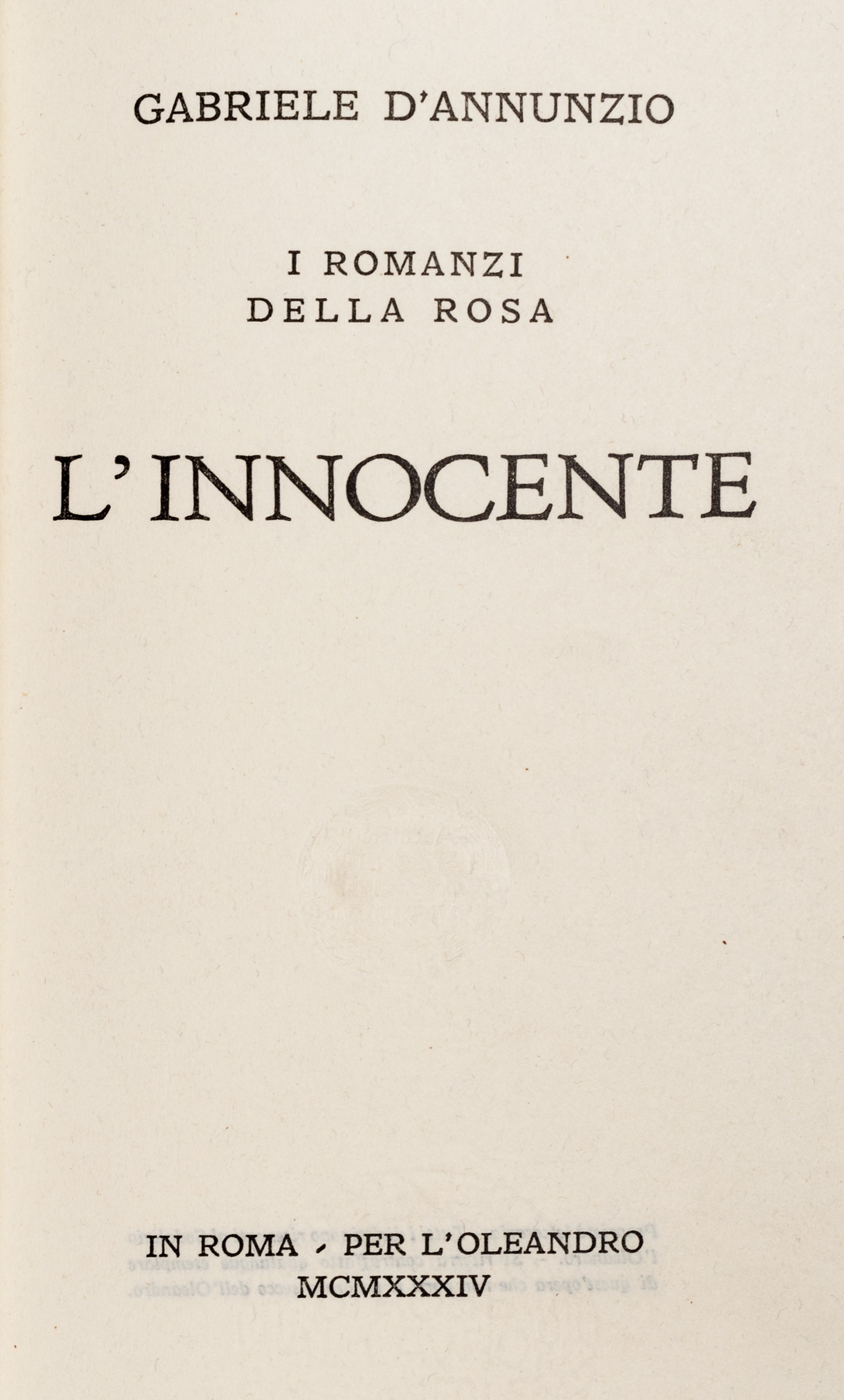 Milano, Fratelli Treves, 1921. In 8°. Con numerose xilografie realizzate da Adolfo de Carolis, leggera brunitura, qualche lieve difetto, rilegato in mezzo marocchino rosso e carta marmorizzata. § Insieme nel lotto altre 14 edizioni d'annunziane: Lettera ai dalmati, Venezia, 1919; La figlia di Iorio, Milano, Treves, s.d.; Il Fuoco, Milano, Cervieri; L'Intrus, Parigi, Calmann Levy, 1894; Contemplazione della morte, Milano, Fratelli Treves, 1920; La fiaccola sotto il moggio, Milano, Fratelli Treves, 1905; L'Innocente, Milano, Treves, 1899; L'Innocente, Roma, L'Oleandro, 1934; Le faville del Maglio, Milano, Treves, 1924; La beffa di Buccari, Milano, Treves, 1918 § Più che l'amore, Milano, Treves, 1907. § Giannantoni, Mario, La vita di Gabriele D'Annunzio, Milano, Mondadori, 1933.