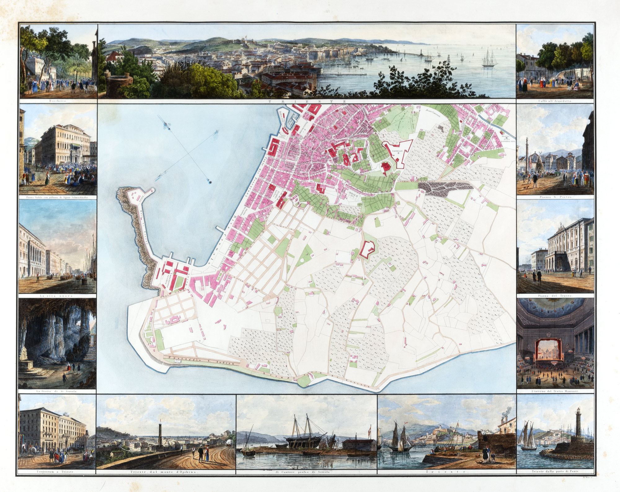 1800 Klafter, 1800, pianta composta di due parti, di mm 630 x mm 802, incisioni su rame acquarellate a mano, la pianta della città è circondata da 14 e 16 riquadri contenenti monumenti e vedute della città, ciascuna con titolo, entrambi i fogli sono firmati in lastra in basso a destra dall'incisore “Fr. Weis Sc.” e a sinistra firmato “Steindr v. H. Engel in Wien”, arrossature e fioriture leggere ai margini bianchi, in cornice di legno marrone del sec. XX.