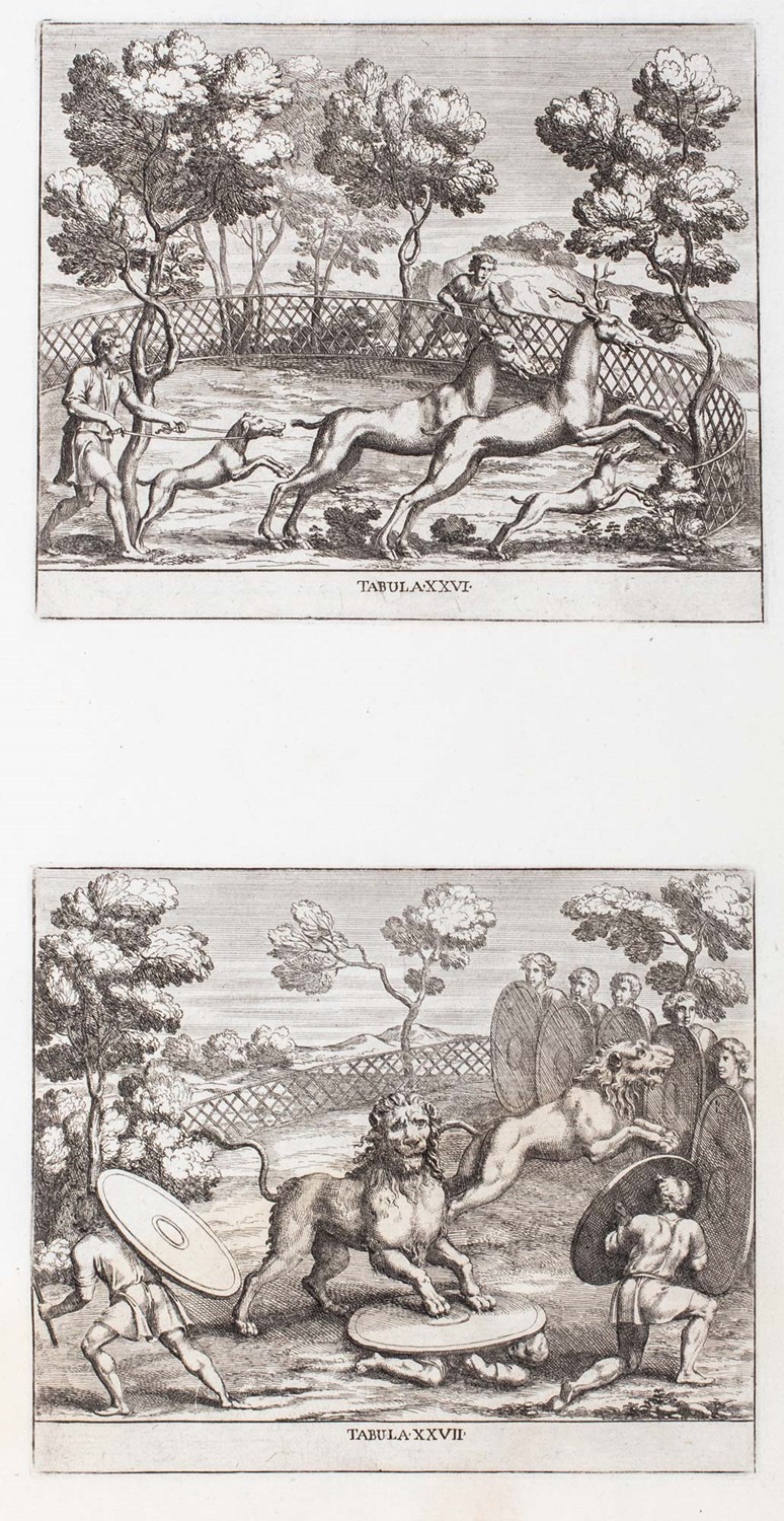 Rome, A. de Rubeis, 1750. In 2°. Con 93 (di 94) tavole numerate fuori testo di cui 7 ripiegate, numerate I-XXIV, I-XXXV, I-XVI, I-IX (mancante la IX Picturae antiquae in aedibus Marchionis de Maximis), testate e grandi iniziali incise, alcune gore d'acqua e leggera brunitura, margine inferiore bianco di alcune carte sciupato, legatura coeva in pergamena con titolo impresso in oro entro tassello al dorso a 6 nervi, alcune macchie ai piatti, bordi sciupati, tre comparti del dorso parzialmente staccati. Notazioni di mano antica alla carta di guardia.