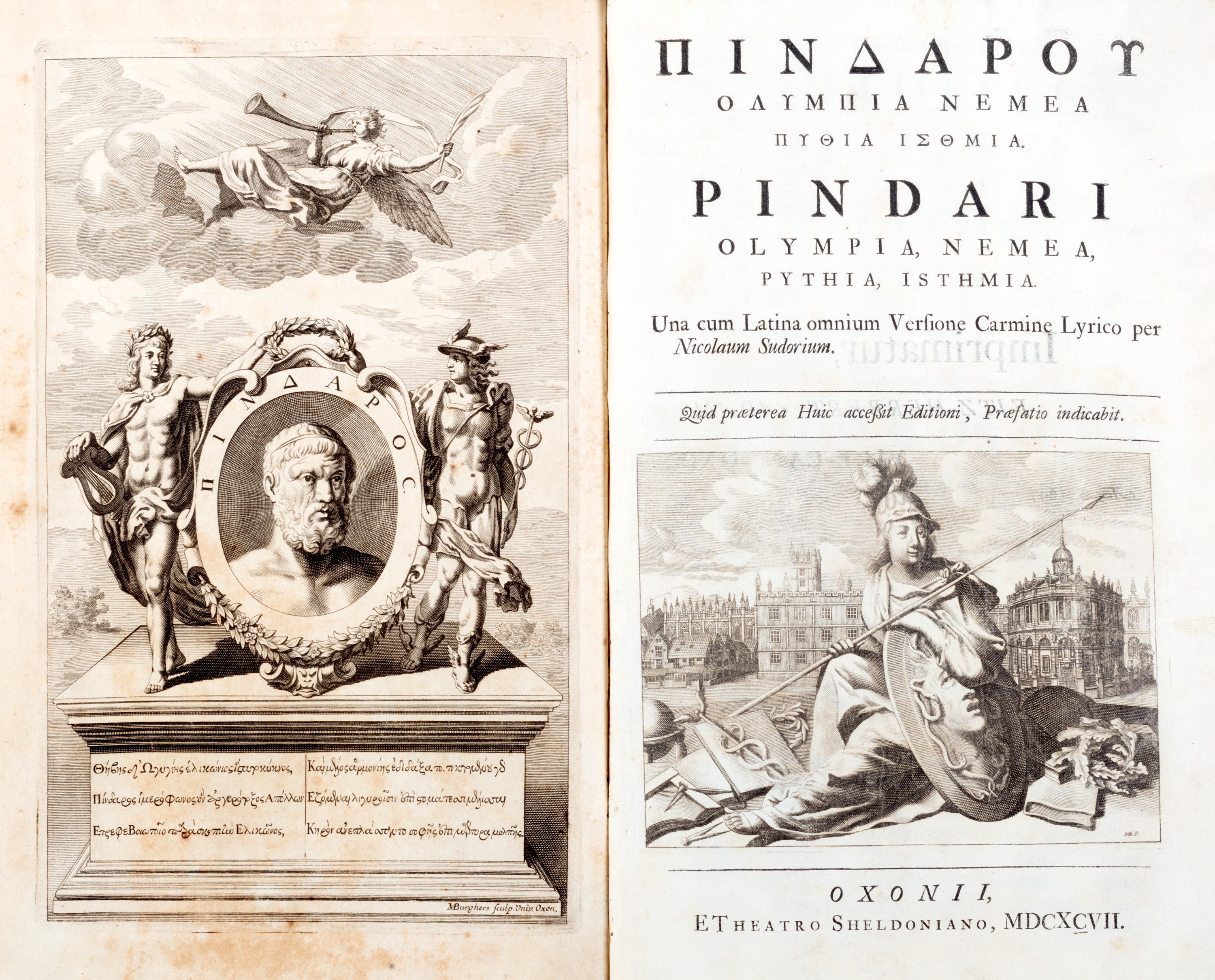 1697 Oxford, Sheldonian Theatre, 1697. In 2°. Elegante antiporta allegorica con il ritratto dell' autore in ovale inciso da M. Burghers, frontespizio con grande vignetta figurata, testo in caratteri greci e latini, strappo a .p.48 lacuna ai margini di p. 291 e 444, diversi fascicoli bruniti, in particolare nella parte finale, qualche macchia ed arrossatura, legatura coeva in vitello marrone, dorso a 6 nervi, ai comparti autore e fregi stilizzati impressi in oro, tagli rossi, qualche spellatura, difetti. Al contropiatto ex libris del Conte della Trinità .