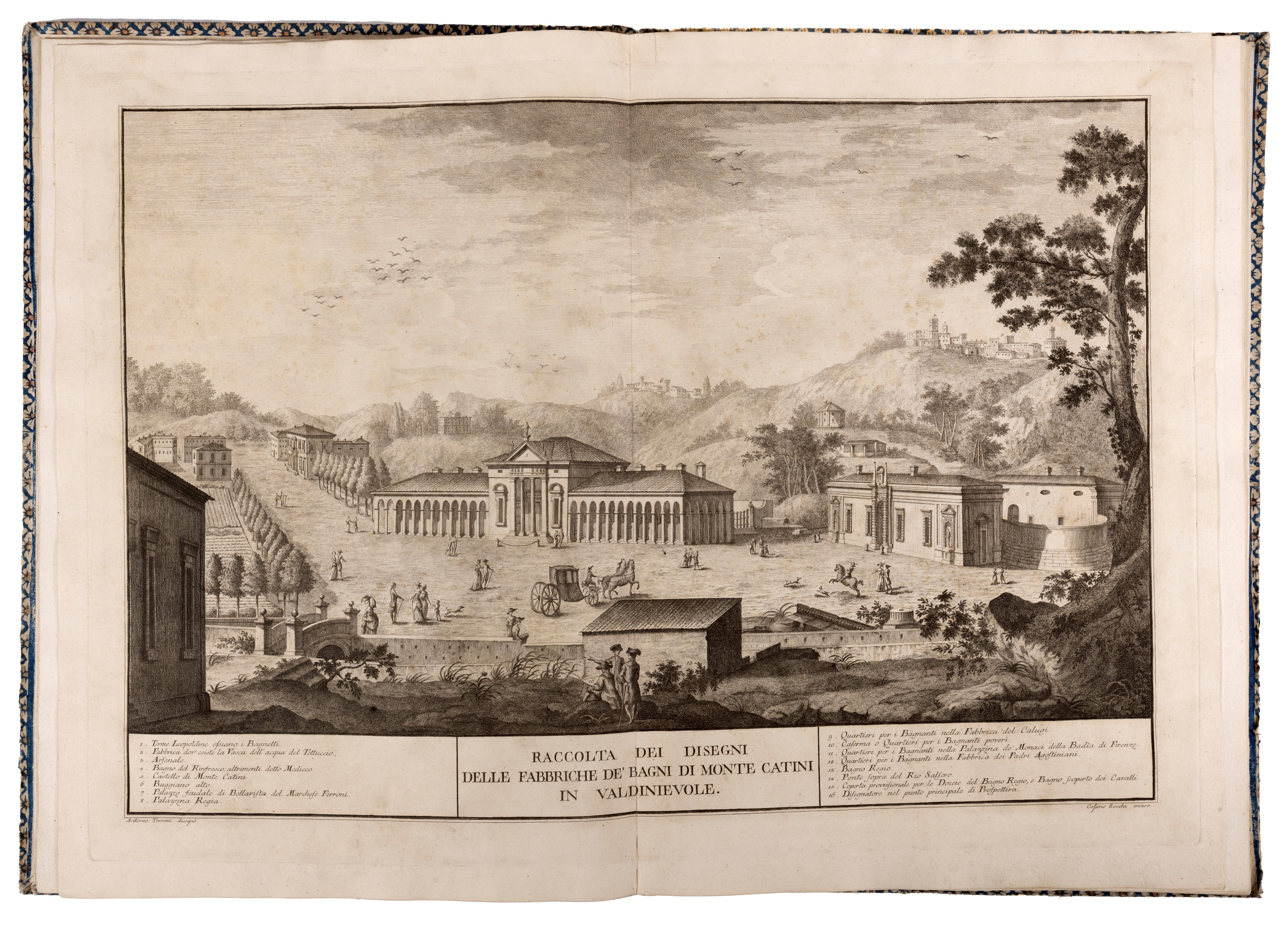 1787 Firenze, s. n., 1787. In 2° grande. Bel frontespizio allegorico inciso da Gaetano Vascellini su disegno di Antonio Terreni, 3 carte, inquadrate da cornice di doppio filetto, con la “Descrizione delle tavole”, elegante capolettera con vedutina, tavola doppia con veduta generale dei bagni, seguono XIV tavole a doppia pagina, incise, tra gli altri, da Cosimo Zocchi, Aniello Lamberti, Gio. Battista Cecchi, Benedetto Cecchi eredi, Ferdinando Gregori ecc., legatura in cartonato ricoperto con carta decorata a xilografia, qualche lacuna. Ex libris “Leonis S. Olschki” applicato al contropiatto.