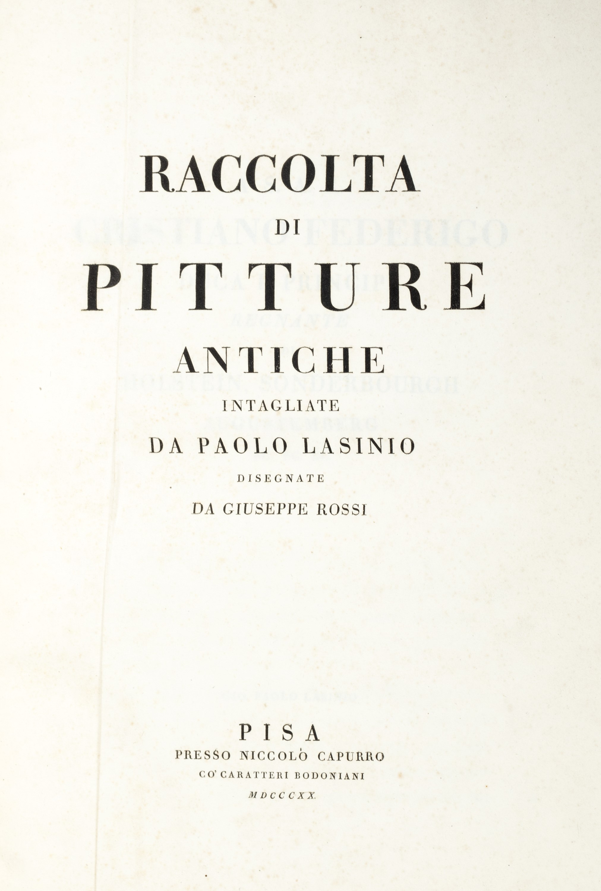 47x34,5 1820 Pisa, Niccolò Capurro, 1820. In 2° grande. Con 14 tavole incise da Lasinio su disegno di Giuseppe Rossi, dedica al duca di Holstein-Sonderburg-Augustenburg, rarissime fioriture nei fascicoli iniziali, legatura coeva in mezzo marocchino verde con angoli, al dorso in oro Pisa, leggeri segni d'usura.