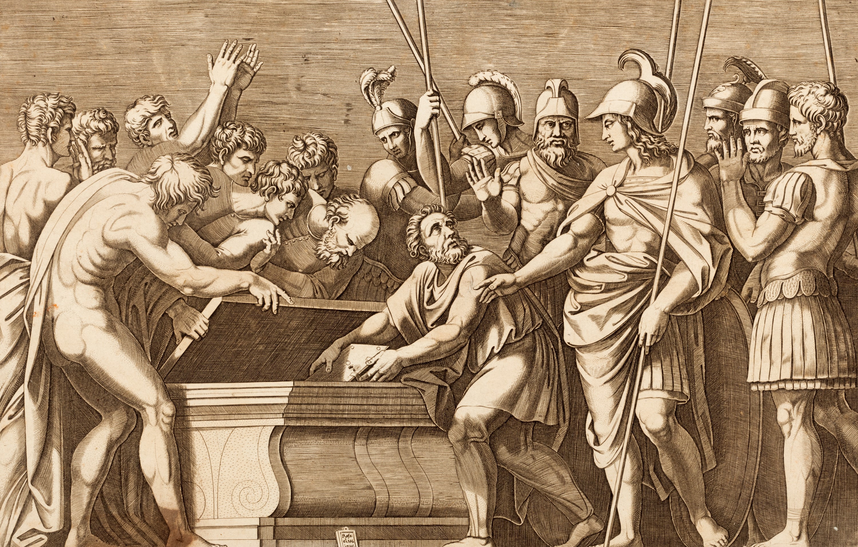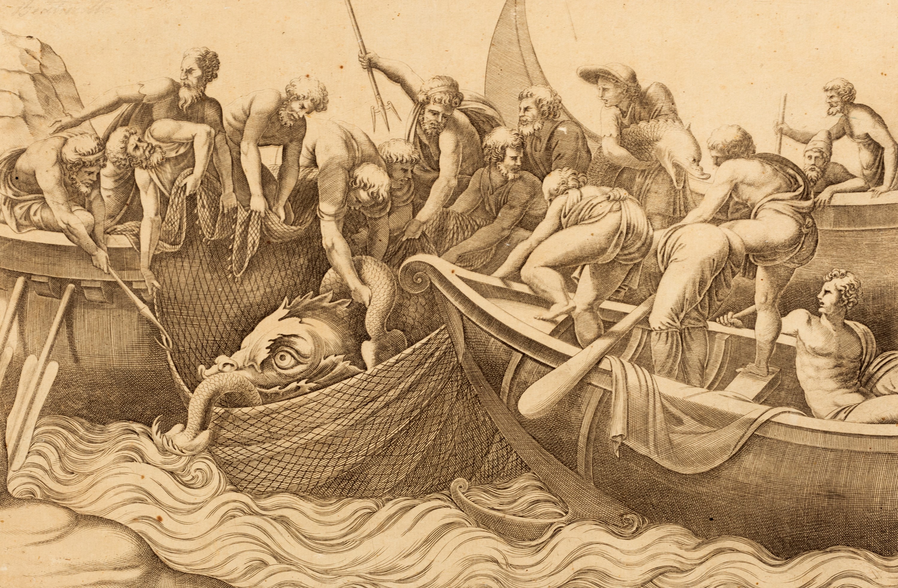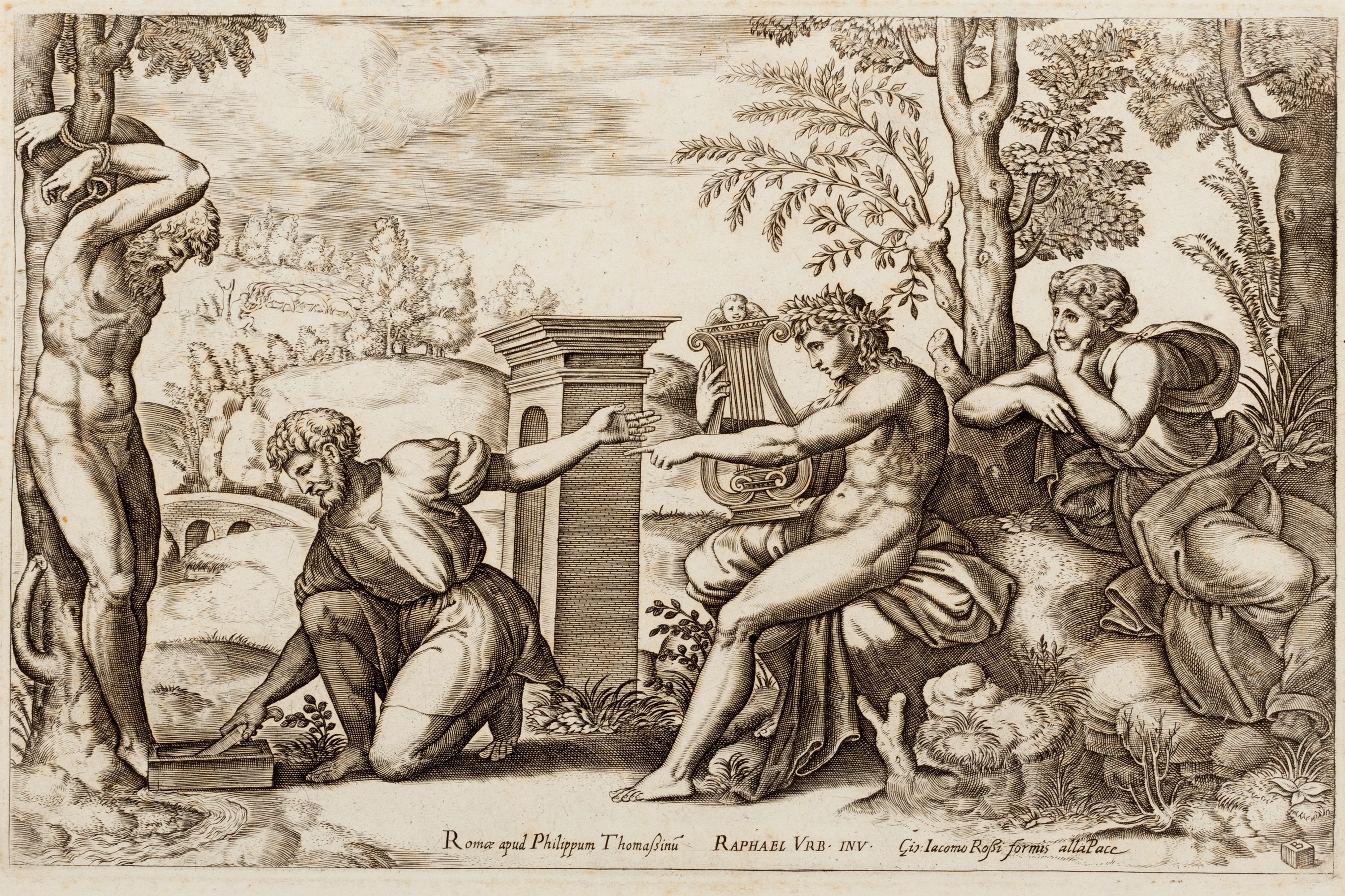 1600 Insieme di 16 incisioni basate su invenzioni di Raffaello, vari incisori, epoche e misure, alcune in tiratura della calcografia, difetti e mancanze.