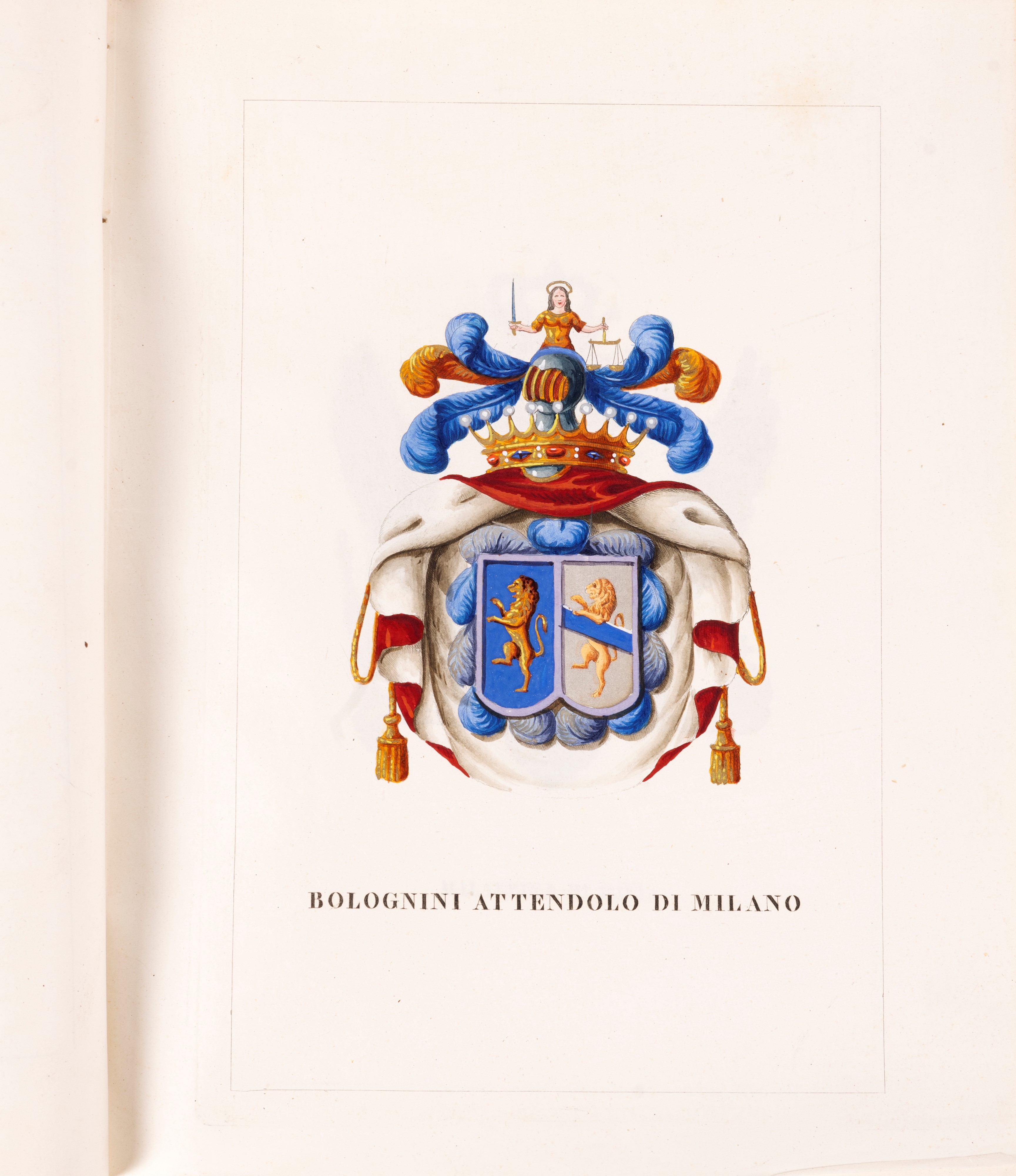 1846 Milano, Claudio Wilmant, 1846. In 4°. 253 x 210 mm. Innumerevoli armi e stemmi familiari colorati, lievi fioriture, legatura coeva in mezza pelle marrone.