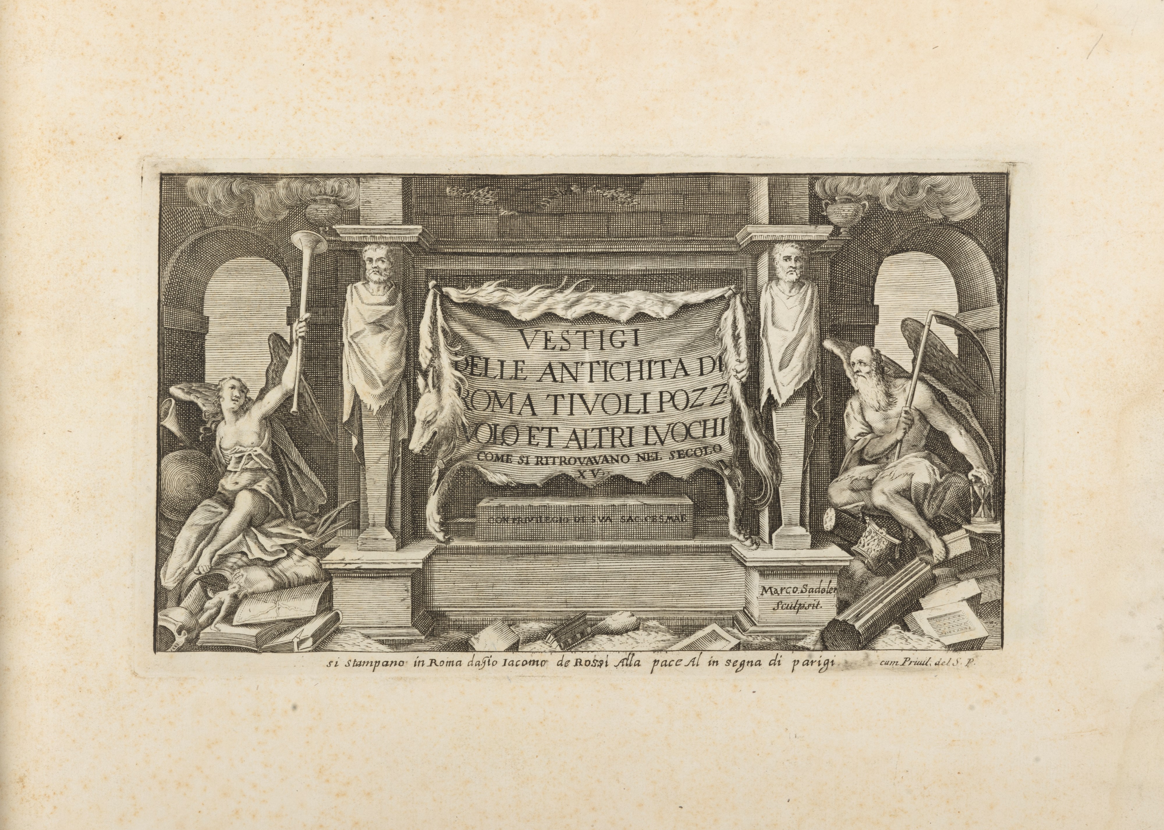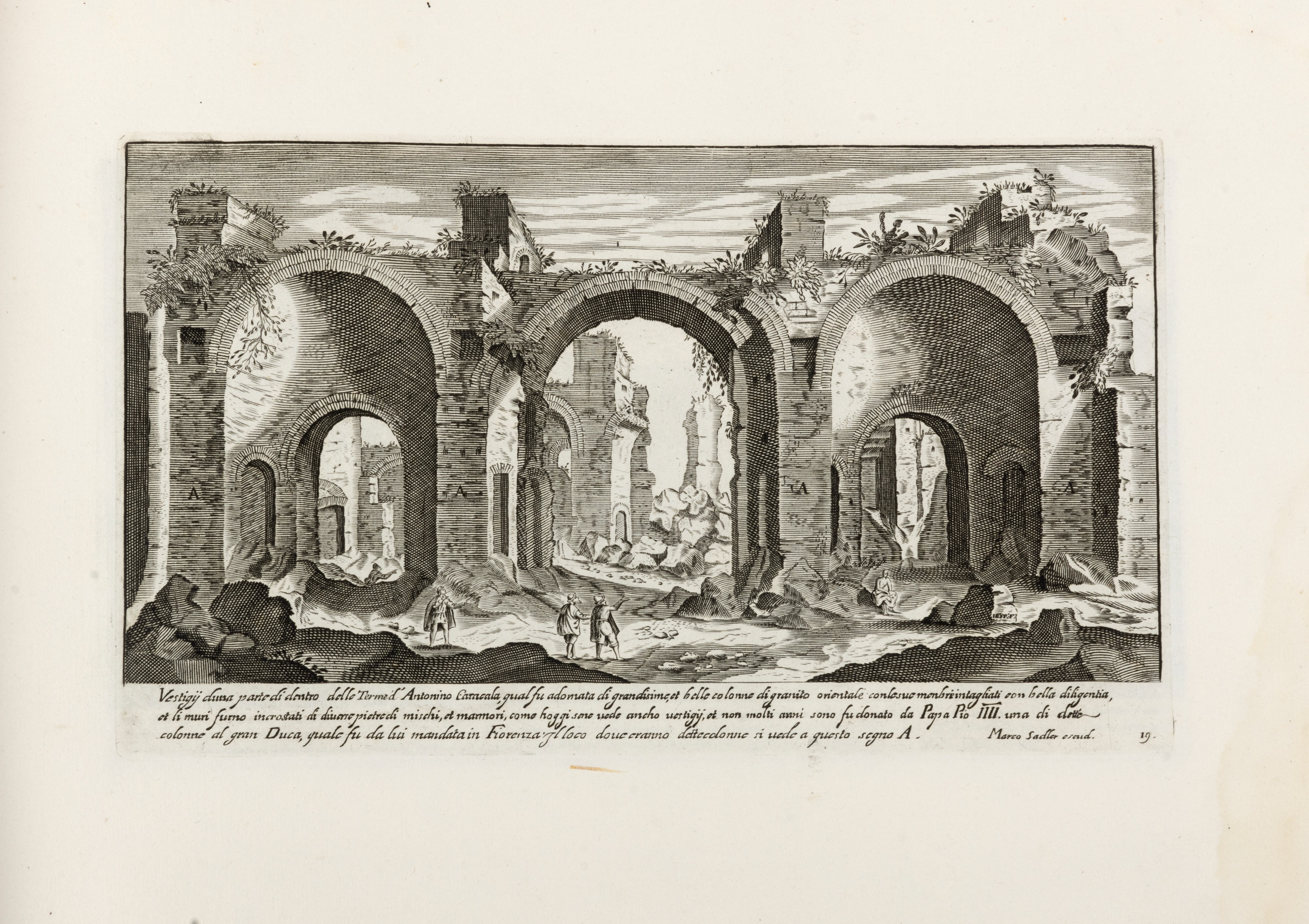 1660 Roma, Giovanni Giacomo de Rossi, [1660]. In 2° oblungo. Frontespizio e tavola dedicatoria incisi, 48 belle tavole all'acquaforte, gora d'acqua al margine esterno che non interessa lo specchio dell'incisione, fioriture lievi alle prime carte, legatura del XIX secolo con piatti in cartone marmorizzato, dorso in pelle con titolo impresso in oro, piccole spellature, leggermente allentato il piatto anteriore. Ex libris Weston library al contropiatto anteriore.