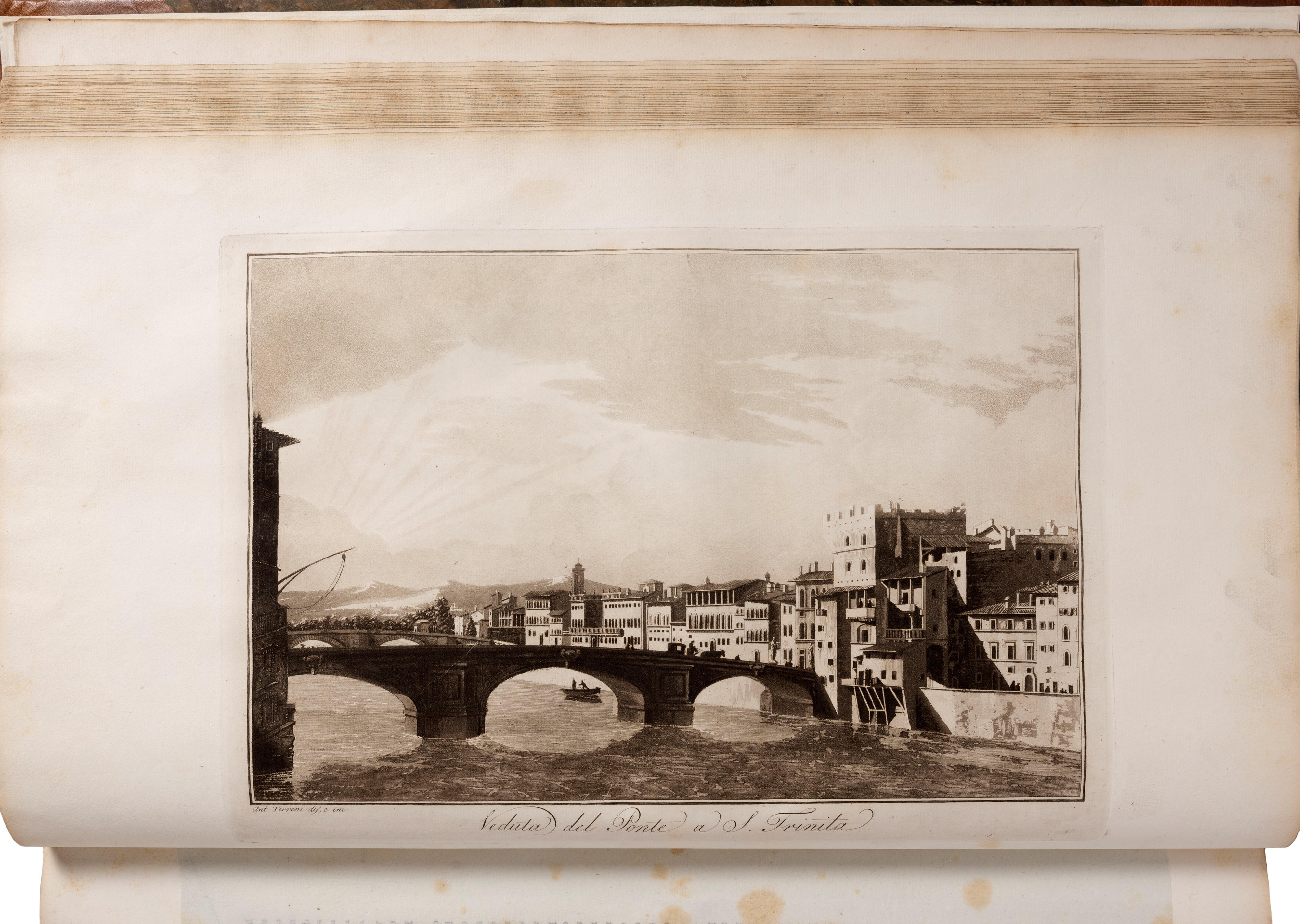 1801 Firenze, Giuseppe Tofani e compagno, 1801. Solo il I volume. In 2°, 542 x 335. Carta geografica della Toscana a doppia pagina, veduta generale di Firenze a doppia pagina, pianta della città di Firenze a doppia pagina, 76 tavole fuori testo incise all'acquatinta, lievi aloni marginali, legatura moderna in mezza pelle e cartone marmorizzato.