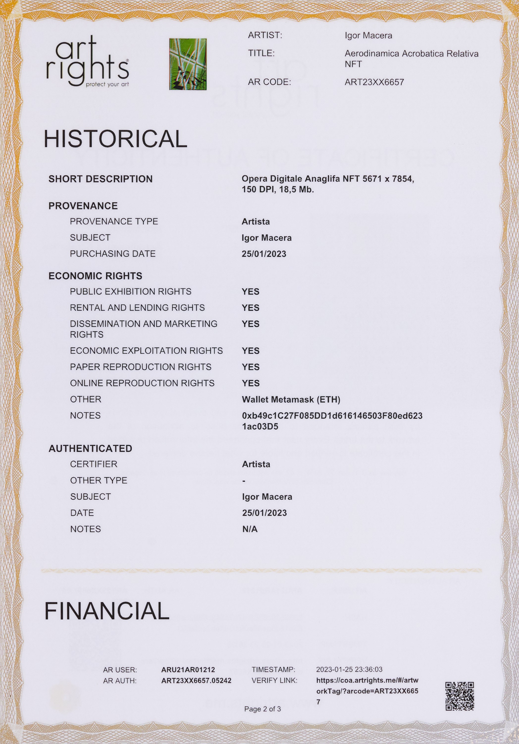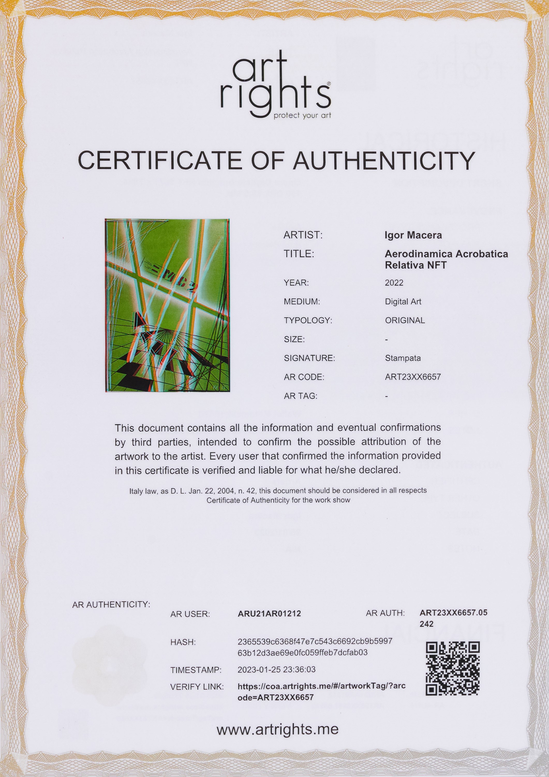 L'opera è accompagnata dal corrispettivo digitale NFT (Non Fungible Token).