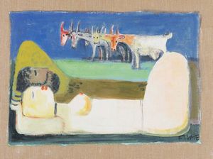Tecnica mista su cartoncino, cm. 24,5x21,5 Firmato in basso al centro. Sul verso: Timbro esposizione illeggibile. [..]
