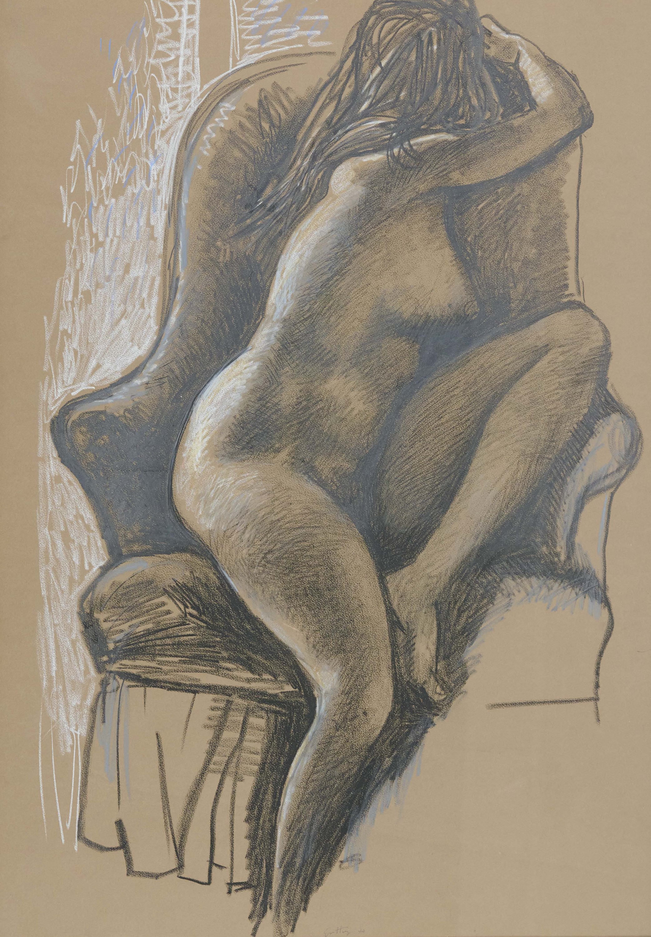 Carboncino, gesso bianco e celeste su carta marrone, cm. 100x70