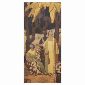 Scuola mitteleuropea, inizio secolo XX DONNE NEL BOSCO olio su tela, cm 199x92, senza cornice Mitteleuropean [..]