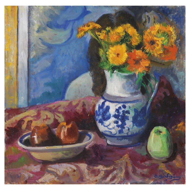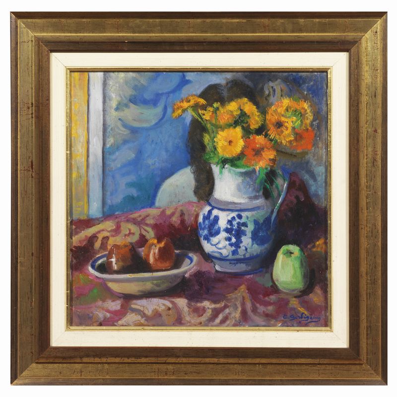 Eduardo Gordigiani (Firenze 1866 - 1961) NATURA MORTA CON VASO DI FIORI E FRUTTA olio su tela, cm 50x50 firmato in basso a destra retro: cartiglio della Galleria d'arte Il Navicello di Pisa