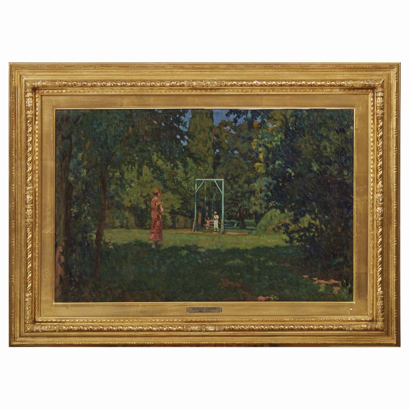 retro: firmato e titolato L'altalena Fauglia, timbro ELENCO G.K. / N.39, timbro Collezione J. Gelati, cartiglio della mostra Giorgio Kienerk, Musei Civici, Pavia, 31 maggio-20 luglio 1997
