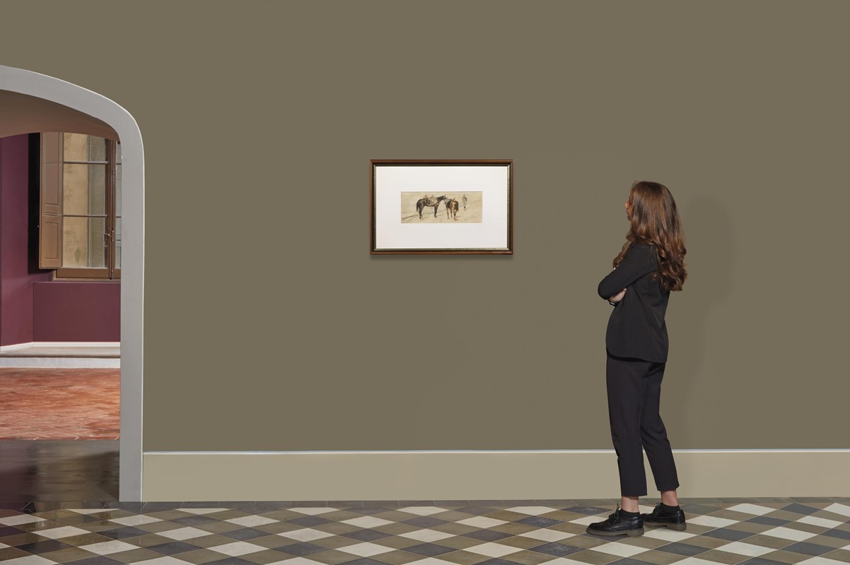 Giovanni Fattori (Livorno 1825 - Firenze 1908) SOLDATO DI ARTIGLIERIA E DUE CAVALLI matita, inchiostro e acquerello su carta, cm 14x35 firmato in basso a destra