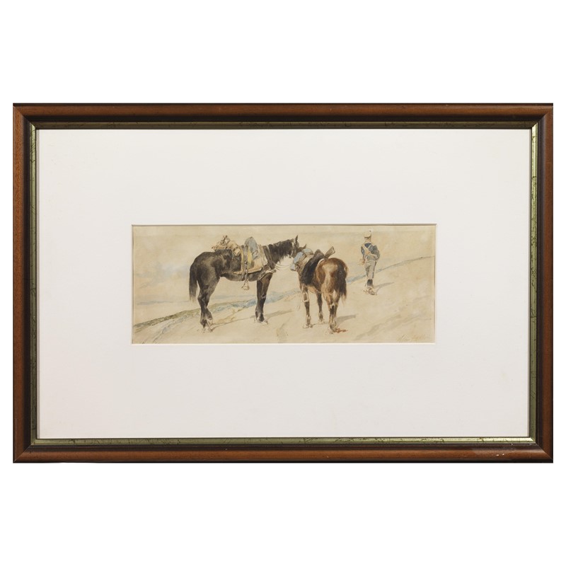 ARTILLERY SOLDIER WITH TWO HORSES pencil, ink and watercolor on paper, 14x35 cm signed lower right