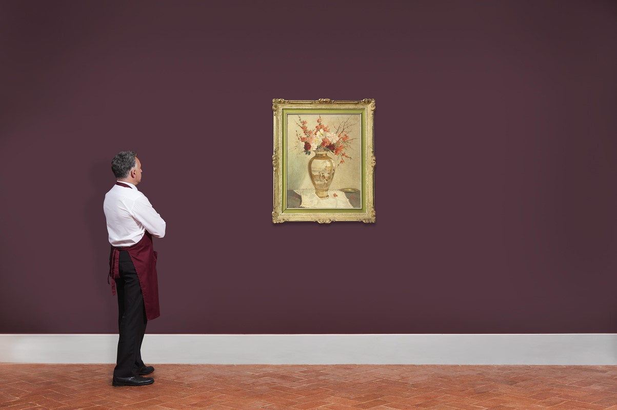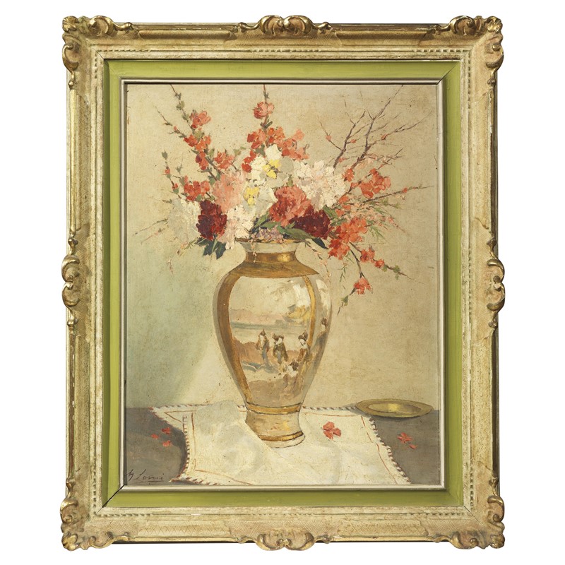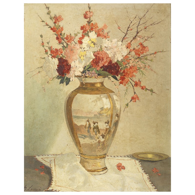Giovanni Lomi (Livorno 1889 - 1969) FIORI NEL VASO CINESE olio su masonite, cm 70x55 firmato in basso a sinistra retro: cartiglio con iscritto "14 / Natura morta / (Fiori)"
