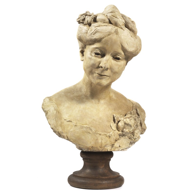 Presentiamo in catalogo il busto in terracotta della violinista torinese Maddalena Maria Teresa -‘Teresina’- Tua (1866-1856), impressionisticamente resa dallo scultore francese Henri Bouchard. Ereditata la passione per la musica dai genitori, Teresina manifesta un precoce talento che le consente di entrare nel 1876 nella classe di violino di Lambert Massart presso il Conservatorio di Parigi, per poi vincere nel 1880 il Grand Prix bandito dallo stesso istituto. La naturale propensione per le esecuzioni virtuosistiche di matrice paganiana, con una spiccata predilezione per la musica di Henryk Wieniawski, conducono la violinista a esibirsi con successo in Europa e Russia, ottenendo la stima e spesso amicizia di compositori e direttori di orchestra, quali Wagner, Liszt, Brahms, Verdi, Wieniawski, Von Bulow, Sgambati o Toscanini e Joachim.