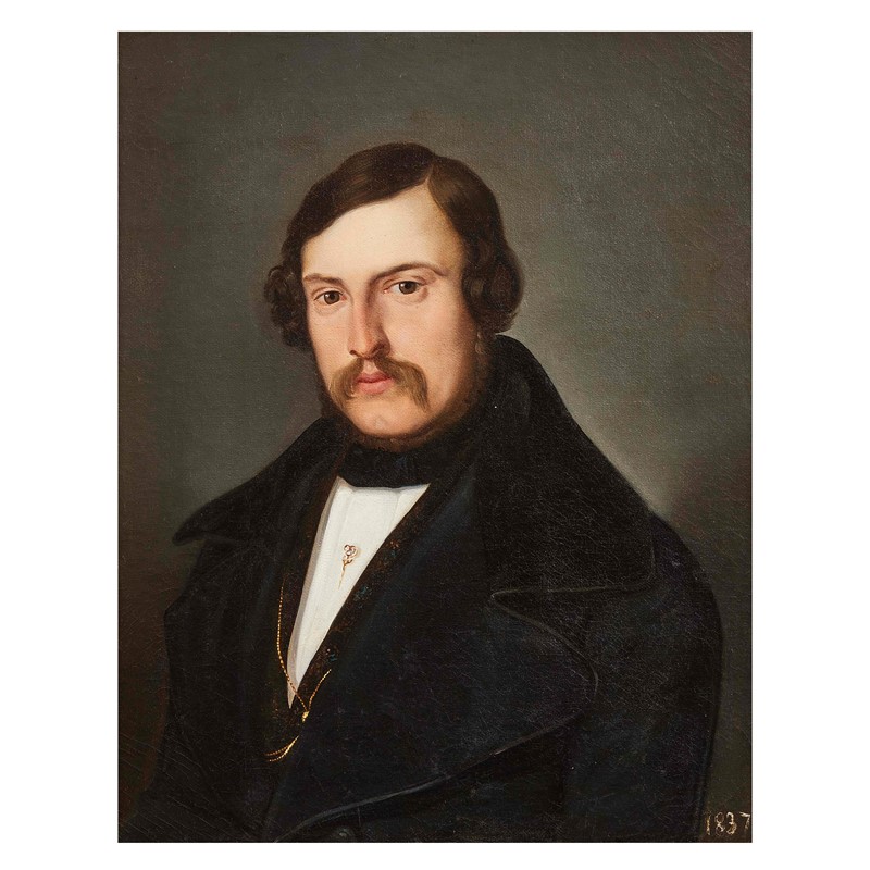 Il distinto gentiluomo immortalato in questo bel ritratto, verosimilmente di scuola lombarda, è l’esploratore Gaetano Osculati (1808-1894). Nato in Brianza e reticente alla prospettiva di una carriera come medico, cui preferì quella di capitano di lungo corso, il giovane Osculati scelse ben presto di sfruttare l’agiatezza economica familiare per divenire cittadino del mondo. Così attraverso il Mediterraneo, dall’Egitto alla Turchia, dalla Siria alla Palestina sino all’india, e attraverso l’Atlantico per avventurarsi nell’America latina, pronto a valicare le Ande e a risalire in canoa il Rio delle Amazzoni, Osculati diviene un celebre esploratore, diffondendo con i propri resoconti la conoscenza di popoli e culture remoti. La sua avventurosa vita attraversa l’intero secolo per spegnersi nella tranquillità di Affori nel 1894.