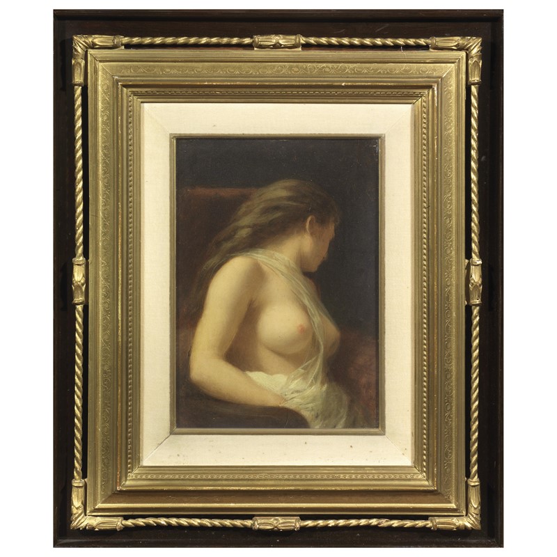 Vito D'Ancona (Pesaro 1825 - Firenze 1884) LA MODELLA olio su cartoncino applicato su tela, cm 28x19,5 retro: sul cartone di copertura iscritto "Vito D'Ancona/Mezza figura di donna/ nuda/ Mario Galli", cartiglio della Libreria Gonnelli