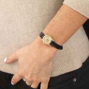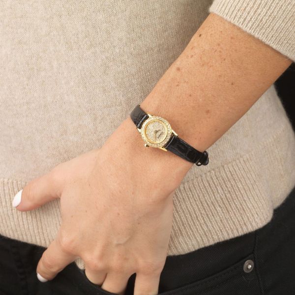 ALDEBERT OROLOGIO DA DONNA IN ORO CON DIAMANTI cassa in oro giallo 18kt, fondello a pressione, lunetta impreziosita da doppia fila di diamanti, quadrante con pavé di diamanti, movimento al quarzo, cinturino in pelle nera lucida, fibbia originale in oro giallo 18kt, vetro minerale, gr. 16. Diam. mm 20
