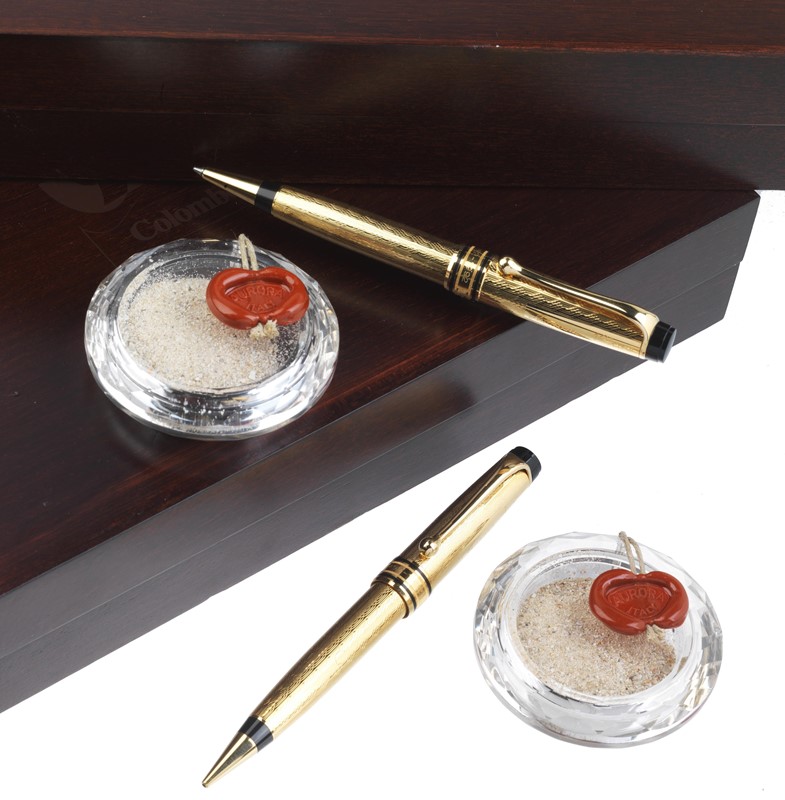 AURORA CRISTOFORO COLOMBO 500° ANNIVERSARIO (1492 – 1992) EDIZIONE LIMITATA PENNA A SFERA E PORTAMINE N. 1028 fusto in metallo dorato finemente decorato a motivo guilloché, dettagli di rifinitura in metallo dorato, meccanismo a rotazione, lungh. cm 13. Corredata di scatola in legno, controscatola, garanzia e contenitore in plexiglass con sabbia dell'isola di San Salvador e piccola pepita d'oro.