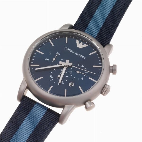 cassa in acciaio satinato, fondello a pressione, ghiera in acciaio, tasti a pompa, corona marcata, quadrante blu, indici applicati, datario tra le quattro e le cinque, contatore dei secondi a ore sei, dei minuti alle nove, delle ore alle tre, movimento al quarzo, cinturino originale in tessuto azzurro/blu, fibbia in acciaio satinato marcata Armani, vetro minerale. Diam. mm 45