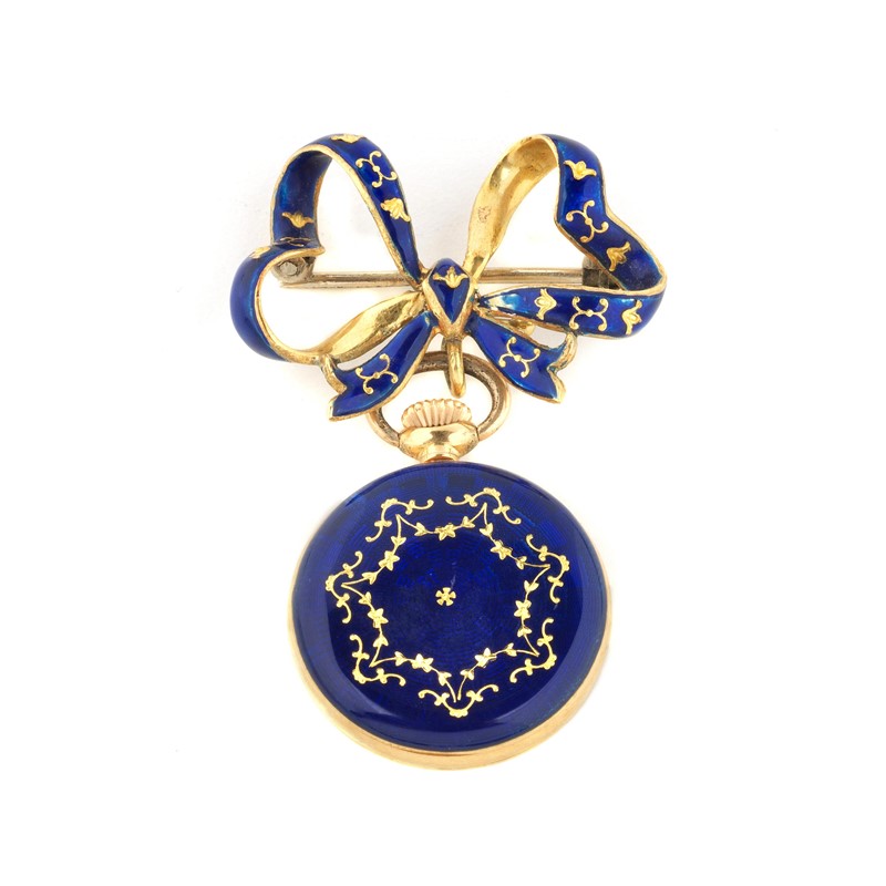 ENICAR ULTRASONIC OROLOGIO CON SPILLA A FIOCCO IN SMALTI cassa in oro giallo 18kt, fondello decorato in smalto blu e ghirlanda dorata, quadrante argenté, numeri arabi applicati, movimento a carica manuale, corredato di spilla a forma di fiocco in oro giallo 18kt decorata in smalto blu con piccoli dettagli oro, vetro plastica, gr. 15. Diam. mm 21