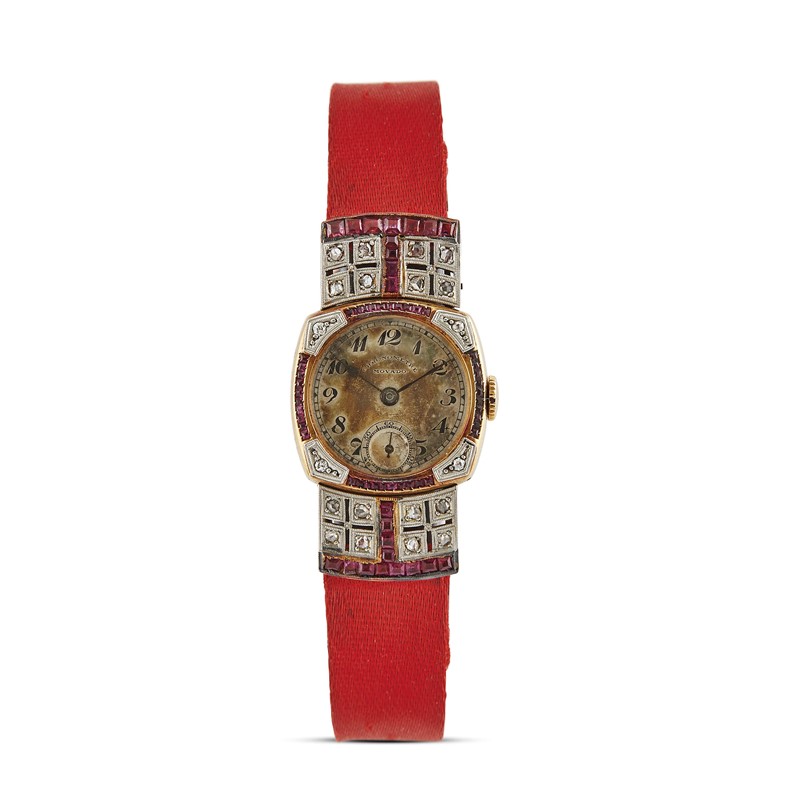 cassa di forma in oro giallo 18kt, fondello a pressione, lunetta e anse finemente impreziosite con rubini e rose di diamante,