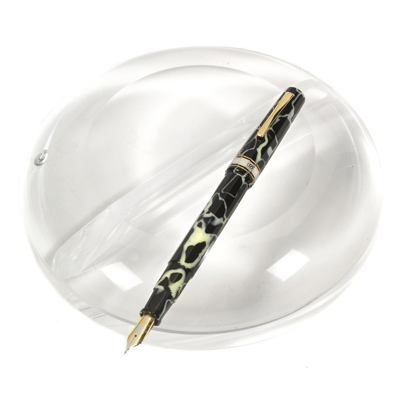 OMAS GALILEO GALILEI 650° ANNIVERSARIO DELLO STUDIO DI PISA (1343 - 1993) PENNA STILOGRAFICA N. 722/4962 fusto in celluloide di colore nero e bianco effetto marmo, dettagli finiture in metallo dorato e argentato, cappuccio con decorazione a motivo greco, pennino in oro 18kt misura F, caricamento a stantuffo, lungh. cm 14. Corredata di scatola in plexiglass circolare, controscatola e garanzia. La scatola presenta rottura.