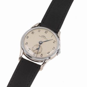 OBRA OROLOGIO DA POLSO cassa in acciaio, fondello a pressione, anse a ragno, quadrante argenté, numeri [..]
