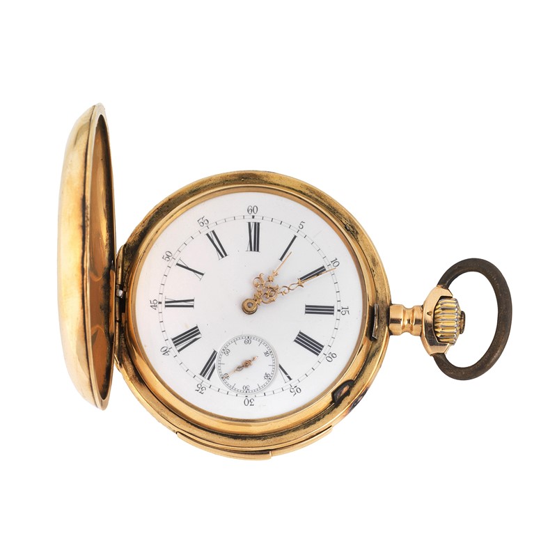 OROLOGIO DA TASCA IN ORO RIPETIZIONE MINUTI cassa in tre parti in oro giallo 18kt, coperchio con decorazione a stemma, quadrante bianco in porcellana, numeri romani a smalto, lancette Luigi XV, secondi a ore sei, movimento a carica manuale, gr. 144. Diam. mm 53 Orologio non funzionante.