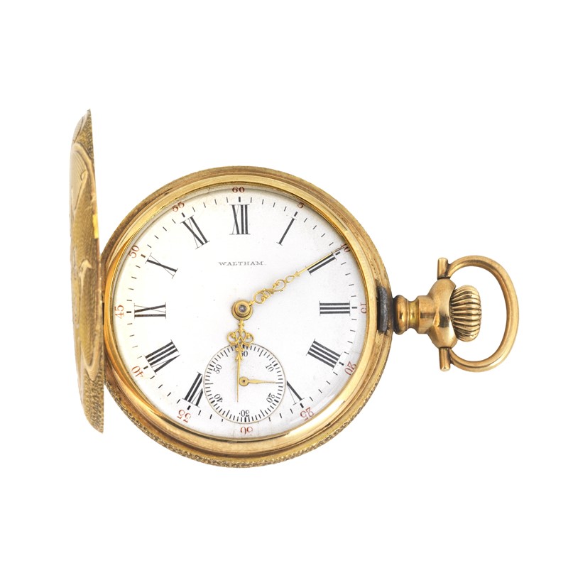 WALTHAM OROLOGIO DA TASCA N. 5601XX cassa in tre parti in oro giallo 14kt, fondello e coperchio finemente decorati con motivi floreali e fogliacei, quadrante bianco in porcellana, numeri romani a smalto, numeri arabi in rosso, lancette Luigi XV, secondi a ore sei, movimento a carica manuale, gr. 93. Diam. mm 48
