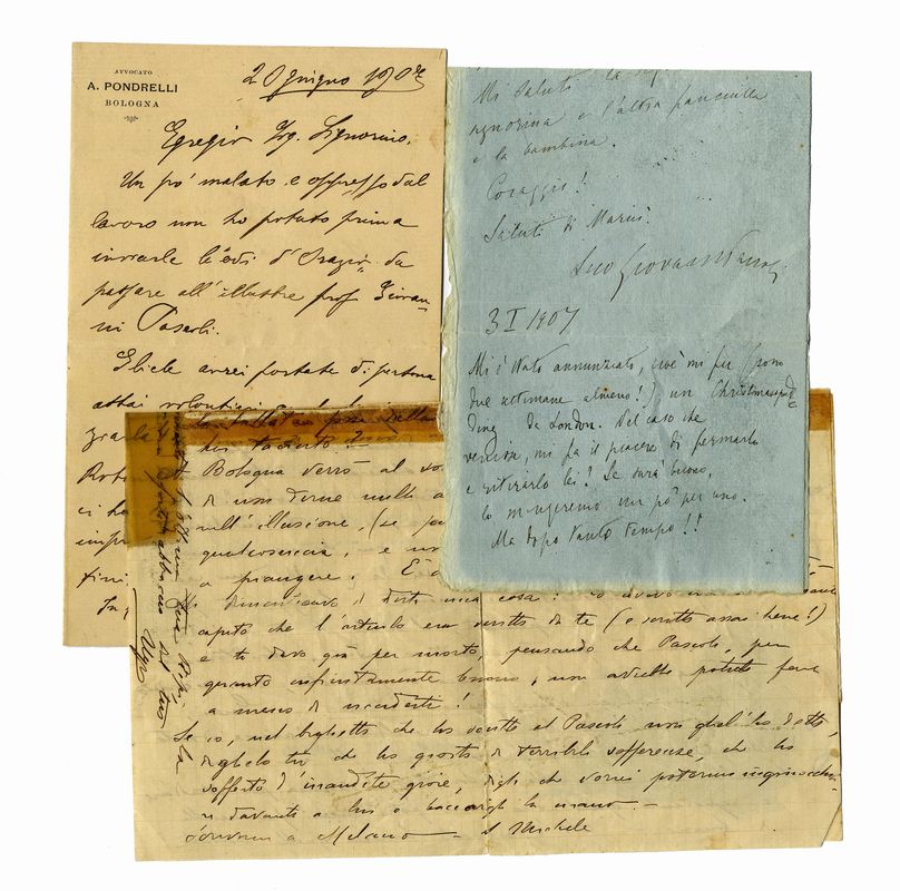 Manoscritto a inchiostro nero su carta azzurra. 1 carta scritta al recto. Nel lotto anche 2 lettere afferenti a Pascoli. Dimensioni: 105x320 mm.