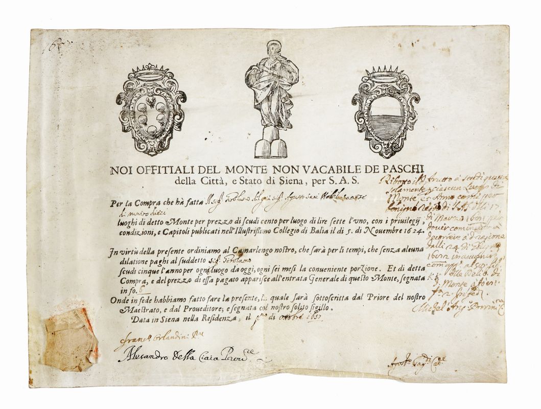 Pergamena stampata con annotazioni e firme manoscritte. Stemma mediceo e della città di Siena, con sigillo in carta parzialmente conservato. Dimensioni: 230x330 mm.