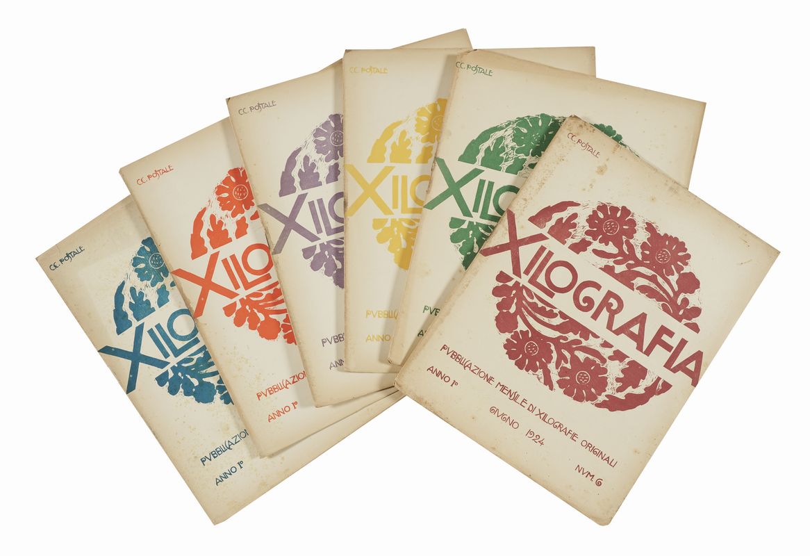 12 fascicoli in-4° (mm 320x250). Dal n. I, anno I (novembre 1924) al n. 18, anno II (giugno 1925). Mancanti il nn. 3, 5, 11 dell'anno I e i nn. 13 e 16 dell'anno II. Strappetti marginali ad alcune carte, macchioline e fioriture sparse, altrimenti opera buona copia, ben completa di un frontespizio in xilografia e 10 tavole per ciascun numero. Tutti i volumi conservano la brossura originale illustrata al piatto anteriore. Presenti lievi difetti e bruniture.