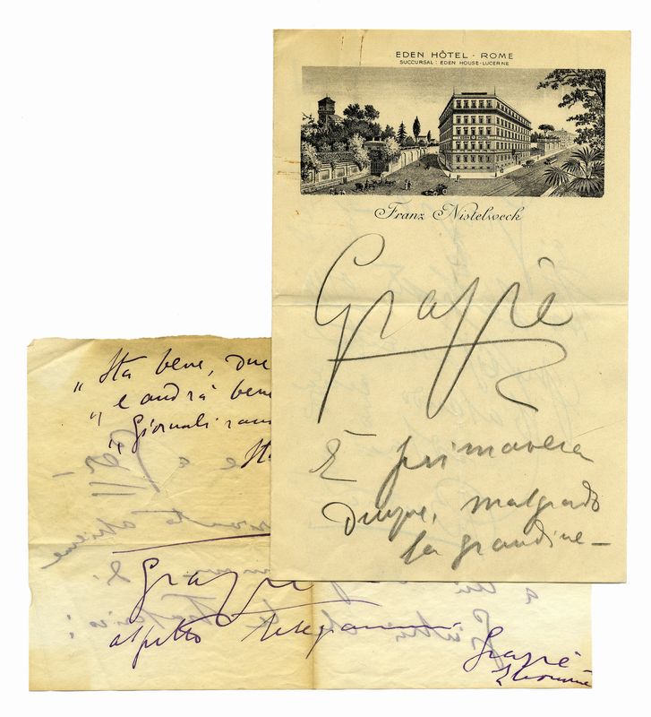 Prima lettera: manoscritto a inchiostro viola. 1 biglietto cartaceo, scritto fronte retro, firmato. Dimensioni 215x135 mm. Seconda lettera: manoscritto a matita nera. 1 bifolio intestato Eden Hôtel Rome con veduta dell’albergo, senza data. 3 pagine, scritte in orizzontale e in verticale. Dimensioni 135x210 mm. Terza lettera: manoscritto a matita nera. 1 modulo stampato per telegrammi dell’Hotel Eden, scritto al verso. Dimensioni 190x265 mm.