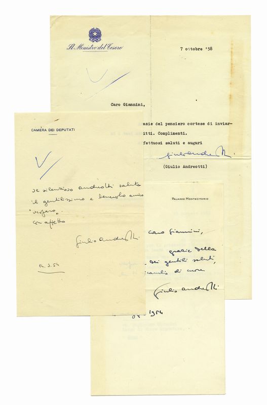 Manoscritti a inchiostro nero e blu. Carte con intestazione "Camera dei Deputati", "On. Giulio Andreotti", "Il Ministro del Tesoro". Dimensioni varie.