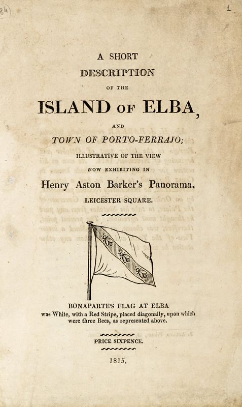 In-8 (mm 230x195). Pagine 11, [1]. Con una bella tavola xilografica più volte ripiegata, rilegata in fine. Bandiera xilografica con le tre api, appositamente creata da Napoleone per l’Elba, al frontespizio. Rinforzato il margine interno del frontespizio e leggermente reintegrato di carta al margine inferiore esterno della carta B2; uno strappo restaurabile alla tavola e una lieve integrazione marginale, senza perdite di inciso; altrimenti buon esemplare in barbe. Legatura moderna in mezza pergamena, con punte e piatti marmorizzati.